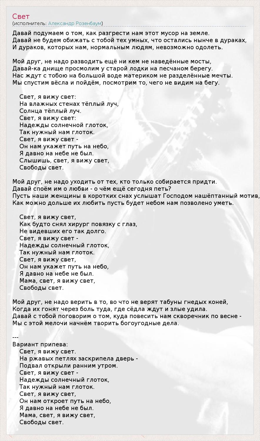 Это интересно:Александр Яковлевич Розенбаум (род. 13 сентября 1951, Ленинград) — исполнитель авторской песни.В 1968—1974 учился в Первом медицинском институте в Ленинграде. Работал врачом скорой помощи. Занимался в вечернем джазовом училище при Дворце культуры имени Кирова. Началом сольной деятельности можно считать памятное выступление 14 октября 1983 года в Доме культуры МВД имени Дзержинского.Розенбаум... продолжение