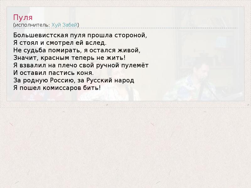 Это интересно:«Хуй Забей» — советская/российская авангардная панк-группа, которую основали в 1989 году школьные друзья «Бигимот» и «Карабас». Ансамбль исполняет панк-рок с нецензурными шуточными текстами, в значительной степени состоящими из мата.До определённого времени тайно, под псевдонимом «Марья Искусница», в записях группы принимала участие певица... продолжение