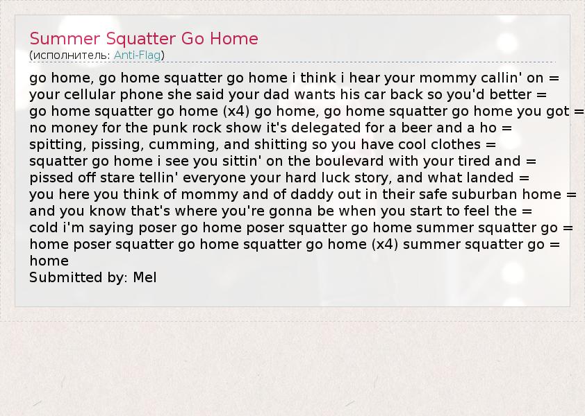 home poser squatter go home squatter go home (x4) summer squatter go =