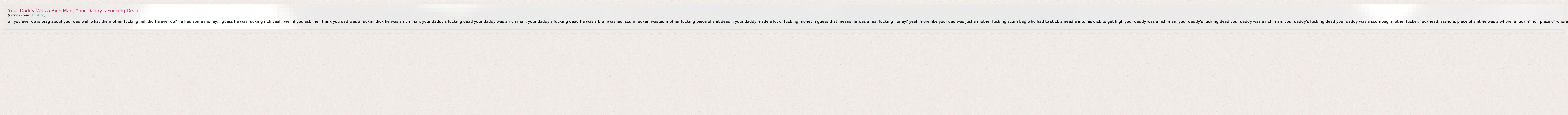 all you ever do is brag about your dad well what the mother fucking hell did he ever do? he had some money, i guess he was fucking rich yeah, well if you ask me i think you dad was a fuckin' dick he was a rich man, your daddy's fucking dead your daddy was a rich man, your daddy's fucking dead he was a brainwashed, scum fucker, wasted mother fucking piece of shit dead... your daddy made a lot of fucking money, i guess that means he was a real fucking honey? yeah more like your dad was just a mother fucking scum bag who had to stick a needle into his dick to get high your daddy was a rich man, your daddy's fucking dead your daddy was a rich man, your daddy's fucking dead your daddy was a scumbag, mother fucker, fuckhead, asshole, piece of shit he was a whore, a fuckin' rich piece of whore