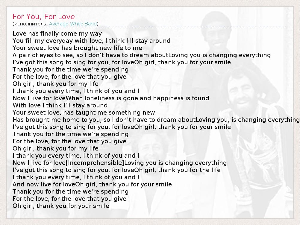 Love has finally come my way You fill my everyday with love, I think I'll stay around Your sweet love has brought new life to me A pair of eyes to see, so I don't have to dream aboutLoving you is changing everything I've got this song to sing for you, for loveOh girl, thank you for your smile Thank you for the time we're spending For the love, for the love that you give Oh girl, thank you for my life I thank you every time, I think of you and I Now I live for loveWhen loneliness is gone and happiness is found With love I think I'll stay around Your sweet love, has taught me something new Has brought me home to you, so I don't have to dream aboutLoving you, is changing everything I've got this song to sing for you, for loveOh girl, thank you for your smile Thank you for the time we're spending For the love, for the love that you give Oh girl, thank you for my life I thank you every time, I think of you and I Now I live for love[Incomprehensible]Loving you is changing everything I've got this song to sing for you, for loveOh girl, thank you for the life I thank you every time, I think of you and I And now live for loveOh girl, thank you for your smile Thank you for the time we're spending For the love, for the love that you give Oh girl, thank you for your smile