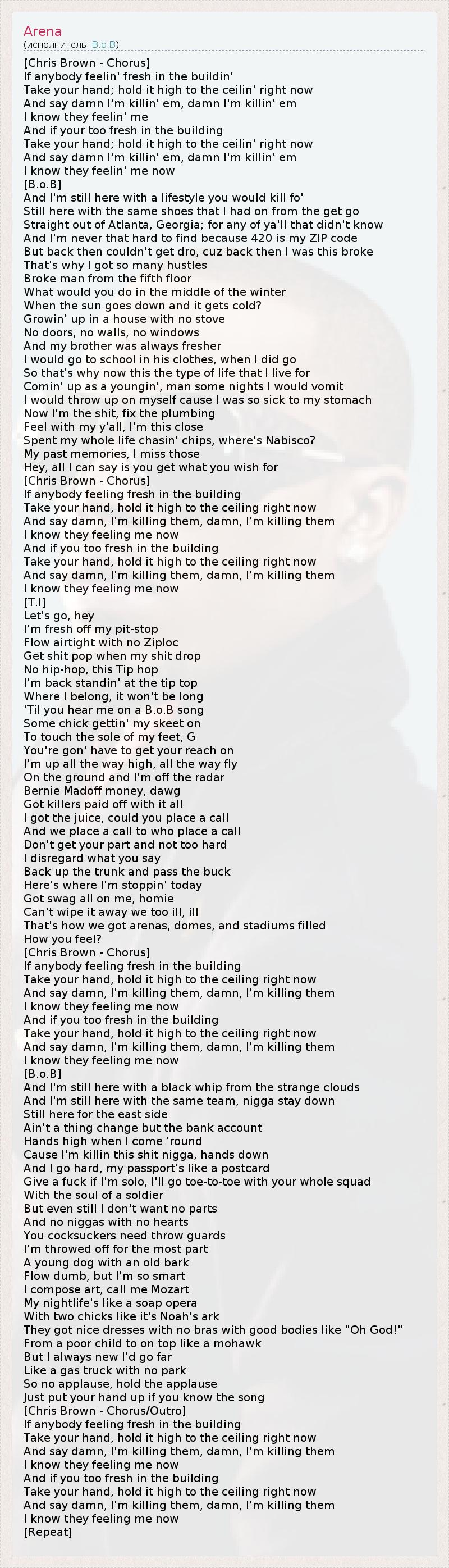 [Chris Brown - Chorus] If anybody feelin' fresh in the buildin' Take your hand; hold it high to the ceilin' right now And say damn I'm killin' em, damn I'm killin' em I know they feelin' me And if your too fresh in the building Take your hand; hold it high to the ceilin' right now And say damn I'm killin' em, damn I'm killin' em I know they feelin' me now [B.o.B] And I'm still here with a lifestyle you would kill fo' Still here with the same shoes that I had on from the get go Straight out of Atlanta, Georgia; for any of ya'll that didn't know And I'm never that hard to find because 420 is my ZIP code But back then couldn't get dro, cuz back then I was this broke That's why I got so many hustles Broke man from the fifth floor What would you do in the middle of the winter When the sun goes down and it gets cold? Growin' up in a house with no stove No doors, no walls, no windows And my brother was always fresher I would go to school in his clothes, when I did go So that's why now this the type of life that I live for Comin' up as a youngin', man some nights I would vomit I would throw up on myself cause I was so sick to my stomach Now I'm the shit, fix the plumbing Feel with my y'all, I'm this close Spent my whole life chasin' chips, where's Nabisco? My past memories, I miss those Hey, all I can say is you get what you wish for [Chris Brown - Chorus] If anybody feeling fresh in the building Take your hand, hold it high to the ceiling right now And say damn, I'm killing them, damn, I'm killing them I know they feeling me now And if you too fresh in the building Take your hand, hold it high to the ceiling right now And say damn, I'm killing them, damn, I'm killing them I know they feeling me now [T.I] Let's go, hey I'm fresh off my pit-stop Flow airtight with no Ziploc Get shit pop when my shit drop No hip-hop, this Tip hop I'm back standin' at the tip top Where I belong, it won't be long 'Til you hear me on a B.o.B song Some chick gettin' my skeet on To touch the sole of my feet, G You're gon' have to get your reach on I'm up all the way high, all the way fly On the ground and I'm off the radar Bernie Madoff money, dawg Got killers paid off with it all I got the juice, could you place a call And we place a call to who place a call Don't get your part and not too hard I disregard what you say Back up the trunk and pass the buck Here's where I'm stoppin' today Got swag all on me, homie Can't wipe it away we too ill, ill That's how we got arenas, domes, and stadiums filled How you feel? [Chris Brown - Chorus] If anybody feeling fresh in the building Take your hand, hold it high to the ceiling right now And say damn, I'm killing them, damn, I'm killing them I know they feeling me now And if you too fresh in the building Take your hand, hold it high to the ceiling right now And say damn, I'm killing them, damn, I'm killing them I know they feeling me now [B.o.B] And I'm still here with a black whip from the strange clouds And I'm still here with the same team, nigga stay down Still here for the east side Ain't a thing change but the bank account Hands high when I come 'round Cause I'm killin this shit nigga, hands down And I go hard, my passport's like a postcard Give a fuck if I'm solo, I'll go toe-to-toe with your whole squad With the soul of a soldier But even still I don't want no parts And no niggas with no hearts You cocksuckers need throw guards I'm throwed off for the most part A young dog with an old bark Flow dumb, but I'm so smart I compose art, call me Mozart My nightlife's like a soap opera With two chicks like it's Noah's ark They got nice dresses with no bras with good bodies like "Oh God!" From a poor child to on top like a mohawk But I always new I'd go far Like a gas truck with no park So no applause, hold the applause Just put your hand up if you know the song [Chris Brown - Chorus/Outro] If anybody feeling fresh in the building Take your hand, hold it high to the ceiling right now And say damn, I'm killing them, damn, I'm killing them I know they feeling me now And if you too fresh in the building Take your hand, hold it high to the ceiling right now And say damn, I'm killing them, damn, I'm killing them I know they feeling me now [Repeat]