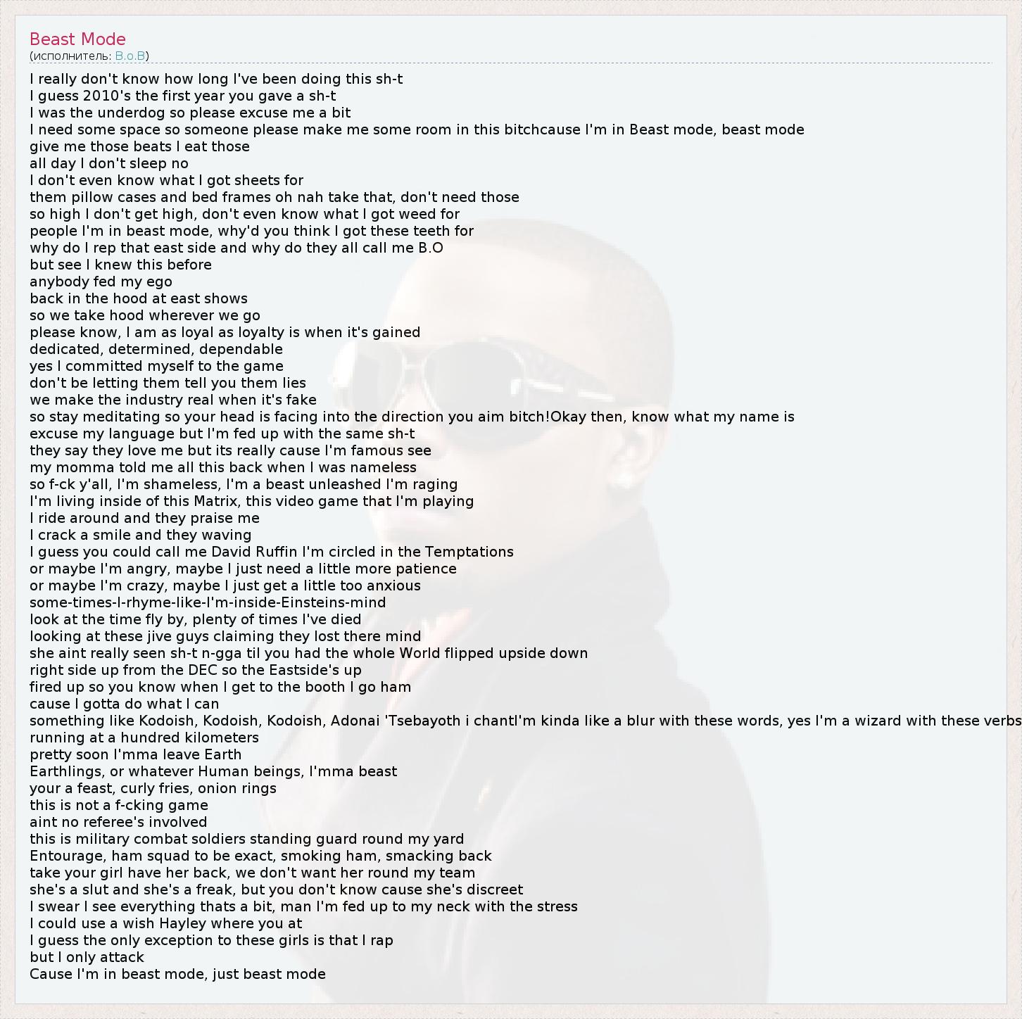 I really don't know how long I've been doing this sh-t I guess 2010's the first year you gave a sh-t I was the underdog so please excuse me a bit I need some space so someone please make me some room in this bitchcause I'm in Beast mode, beast mode give me those beats I eat those all day I don't sleep no I don't even know what I got sheets for them pillow cases and bed frames oh nah take that, don't need those so high I don't get high, don't even know what I got weed for people I'm in beast mode, why'd you think I got these teeth for why do I rep that east side and why do they all call me B.O but see I knew this before anybody fed my ego back in the hood at east shows so we take hood wherever we go please know, I am as loyal as loyalty is when it's gained dedicated, determined, dependable yes I committed myself to the game don't be letting them tell you them lies we make the industry real when it's fake so stay meditating so your head is facing into the direction you aim bitch!Okay then, know what my name is excuse my language but I'm fed up with the same sh-t they say they love me but its really cause I'm famous see my momma told me all this back when I was nameless so f-ck y'all, I'm shameless, I'm a beast unleashed I'm raging I'm living inside of this Matrix, this video game that I'm playing I ride around and they praise me I crack a smile and they waving I guess you could call me David Ruffin I'm circled in the Temptations or maybe I'm angry, maybe I just need a little more patience or maybe I'm crazy, maybe I just get a little too anxious some-times-I-rhyme-like-I'm-inside-Einsteins-mind look at the time fly by, plenty of times I've died looking at these jive guys claiming they lost there mind she aint really seen sh-t n-gga til you had the whole World flipped upside down right side up from the DEC so the Eastside's up fired up so you know when I get to the booth I go ham cause I gotta do what I can something like Kodoish, Kodoish, Kodoish, Adonai 'Tsebayoth i chantI'm kinda like a blur with these words, yes I'm a wizard with these verbs running at a hundred kilometers pretty soon I'mma leave Earth Earthlings, or whatever Human beings, I'mma beast your a feast, curly fries, onion rings this is not a f-cking game aint no referee's involved this is military combat soldiers standing guard round my yard Entourage, ham squad to be exact, smoking ham, smacking back take your girl have her back, we don't want her round my team she's a slut and she's a freak, but you don't know cause she's discreet I swear I see everything thats a bit, man I'm fed up to my neck with the stress I could use a wish Hayley where you at I guess the only exception to these girls is that I rap but I only attack Cause I'm in beast mode, just beast mode