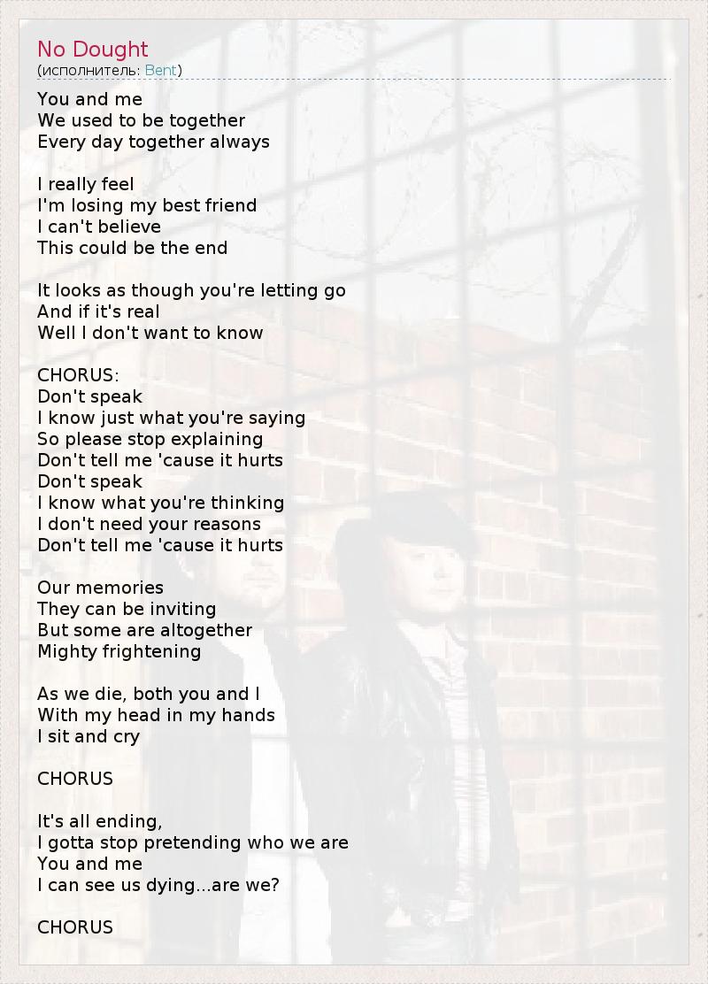 You and me We used to be together Every day together always I really feel I'm losing my best friend I can't believe This could be the end It looks as though you're letting go And if it's real Well I don't want to know CHORUS: Don't speak I know just what you're saying So please stop explaining Don't tell me 'cause it hurts Don't speak I know what you're thinking I don't need your reasons Don't tell me 'cause it hurts Our memories They can be inviting But some are altogether Mighty frightening As we die, both you and I With my head in my hands I sit and cry CHORUS It's all ending, I gotta stop pretending who we are You and me I can see us dying...are we? CHORUS