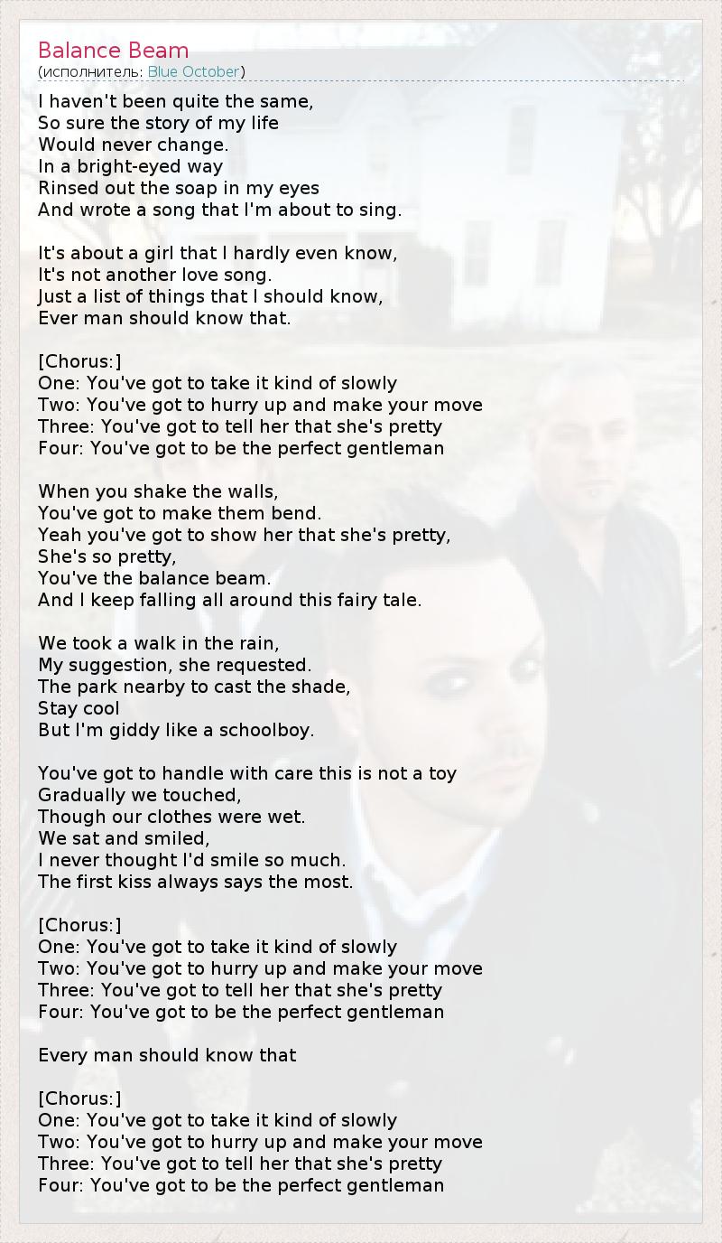 I haven't been quite the same, So sure the story of my life Would never change. In a bright-eyed way Rinsed out the soap in my eyes And wrote a song that I'm about to sing. It's about a girl that I hardly even know, It's not another love song. Just a list of things that I should know, Ever man should know that. [Chorus:] One: You've got to take it kind of slowly Two: You've got to hurry up and make your move Three: You've got to tell her that she's pretty Four: You've got to be the perfect gentleman When you shake the walls, You've got to make them bend. Yeah you've got to show her that she's pretty, She's so pretty, You've the balance beam. And I keep falling all around this fairy tale. We took a walk in the rain, My suggestion, she requested. The park nearby to cast the shade, Stay cool But I'm giddy like a schoolboy. You've got to handle with care this is not a toy Gradually we touched, Though our clothes were wet. We sat and smiled, I never thought I'd smile so much. The first kiss always says the most. [Chorus:] One: You've got to take it kind of slowly Two: You've got to hurry up and make your move Three: You've got to tell her that she's pretty Four: You've got to be the perfect gentleman Every man should know that [Chorus:] One: You've got to take it kind of slowly Two: You've got to hurry up and make your move Three: You've got to tell her that she's pretty Four: You've got to be the perfect gentleman