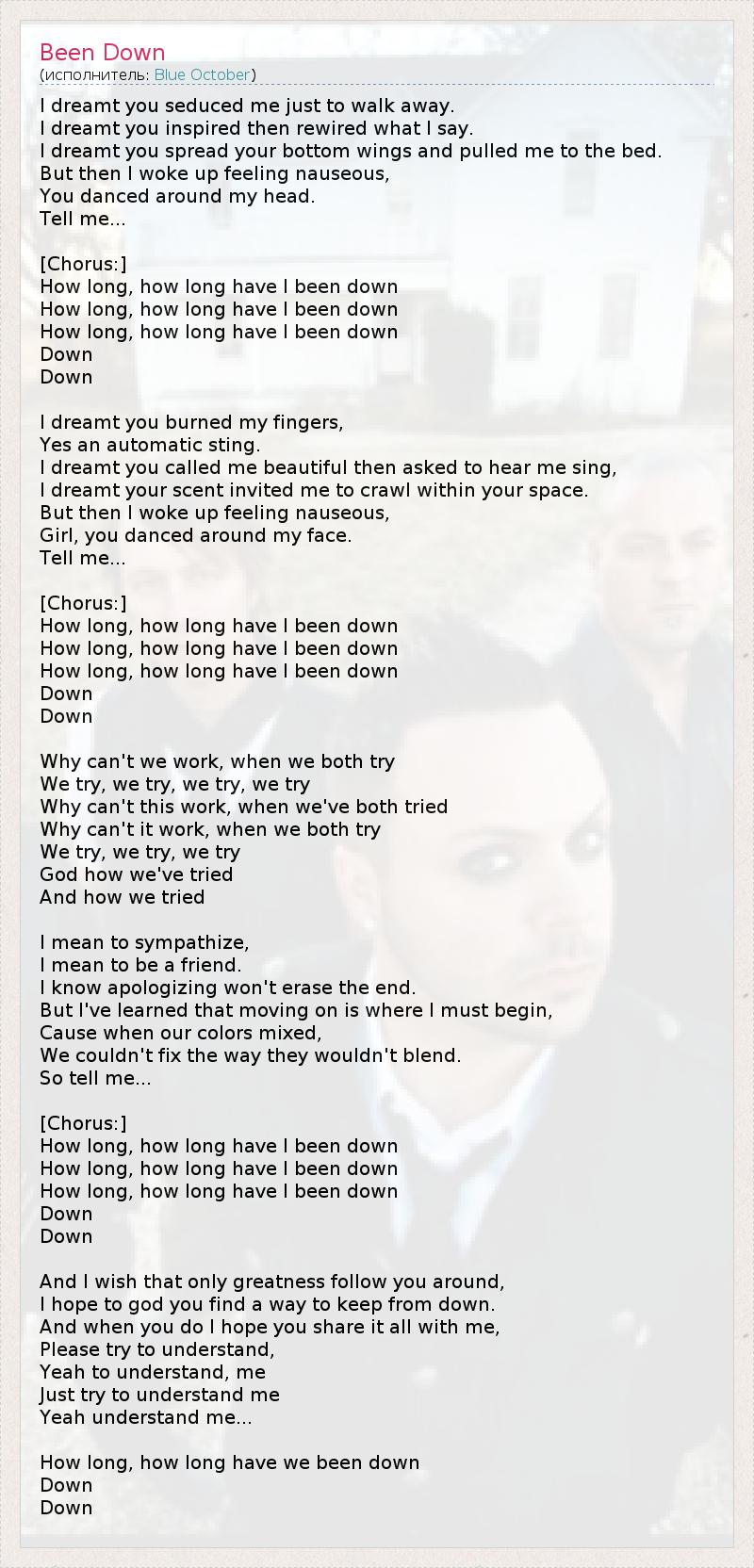 I dreamt you seduced me just to walk away. I dreamt you inspired then rewired what I say. I dreamt you spread your bottom wings and pulled me to the bed. But then I woke up feeling nauseous, You danced around my head. Tell me... [Chorus:] How long, how long have I been down How long, how long have I been down How long, how long have I been down Down Down I dreamt you burned my fingers, Yes an automatic sting. I dreamt you called me beautiful then asked to hear me sing, I dreamt your scent invited me to crawl within your space. But then I woke up feeling nauseous, Girl, you danced around my face. Tell me... [Chorus:] How long, how long have I been down How long, how long have I been down How long, how long have I been down Down Down Why can't we work, when we both try We try, we try, we try, we try Why can't this work, when we've both tried Why can't it work, when we both try We try, we try, we try God how we've tried And how we tried I mean to sympathize, I mean to be a friend. I know apologizing won't erase the end. But I've learned that moving on is where I must begin, Cause when our colors mixed, We couldn't fix the way they wouldn't blend. So tell me... [Chorus:] How long, how long have I been down How long, how long have I been down How long, how long have I been down Down Down And I wish that only greatness follow you around, I hope to god you find a way to keep from down. And when you do I hope you share it all with me, Please try to understand, Yeah to understand, me Just try to understand me Yeah understand me... How long, how long have we been down Down Down
