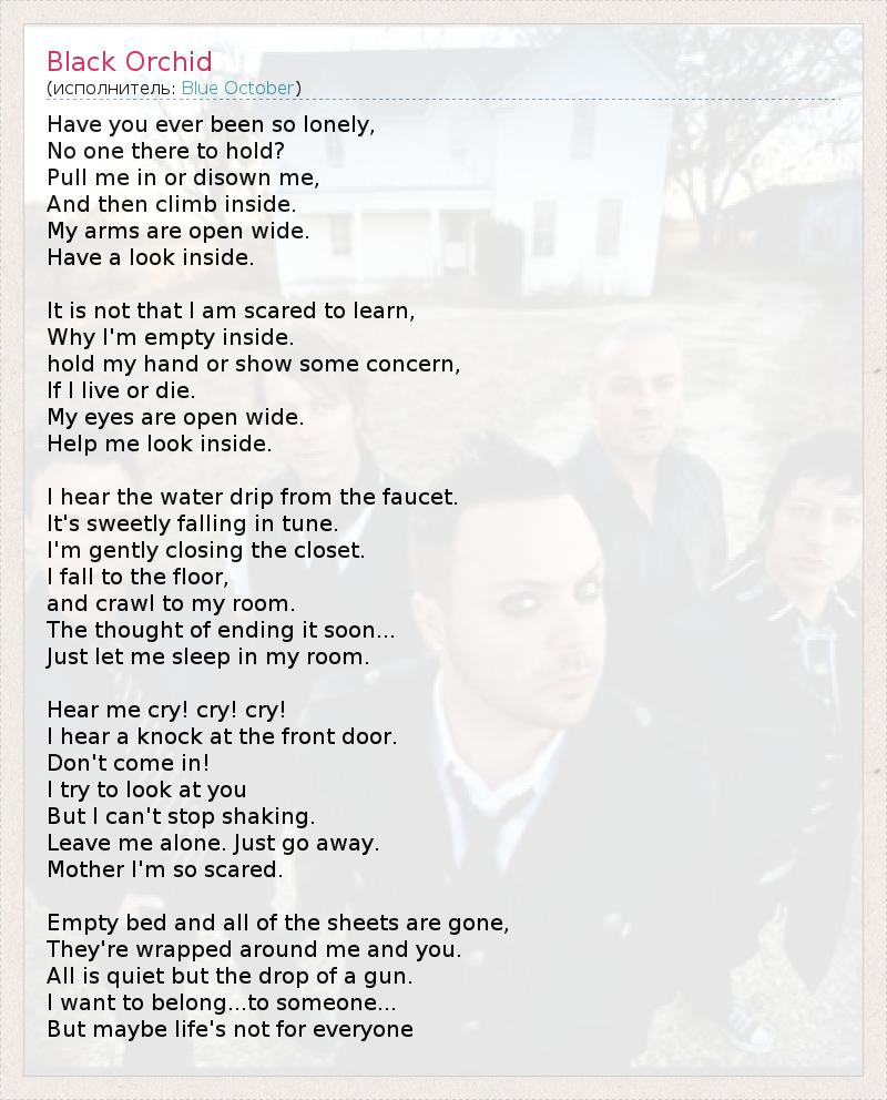 Чёрная орхидея Ты когда-либо была настолько одинокой, Чтобы не было никого, чтобы удержать? Привлеки меня к себе или откажись от меня, А затем проникни внутрь. Мои руки широко открыты. Взгляни внутрь. Я испуган не до такой степени, чтобы узнать, Почему я пуст внутри. Держи мою руку или прояви немного беспокойства, Если я живой или умираю. Мои глаза широко открыты. Помоги мне заглянуть внутрь. Я слышу стук капель из крана. На эти звуки приятно ложится мелодия. Я мягко закрываю шкаф, Я падаю на пол, И с трудом ползу к своей комнате. Мысли об окончании этого в скором времени... Только позволь мне спать в моей комнате. Услышь, что я кричу! кричу! кричу! Я слышу удар в переднюю дверь. Не входить! Я пытаюсь смотреть на тебя, Но я не могу прекратить дрожать. Оставь меня в покое. Только уйди. Мама, я так боюсь. Пустая кровать и все простыни сдёрнуты, Они обернуты вокруг меня и тебя. Все спокойно, но моё оружие поникло. Я хочу принадлежать... кому-то... Но возможно жизнь не для всех.