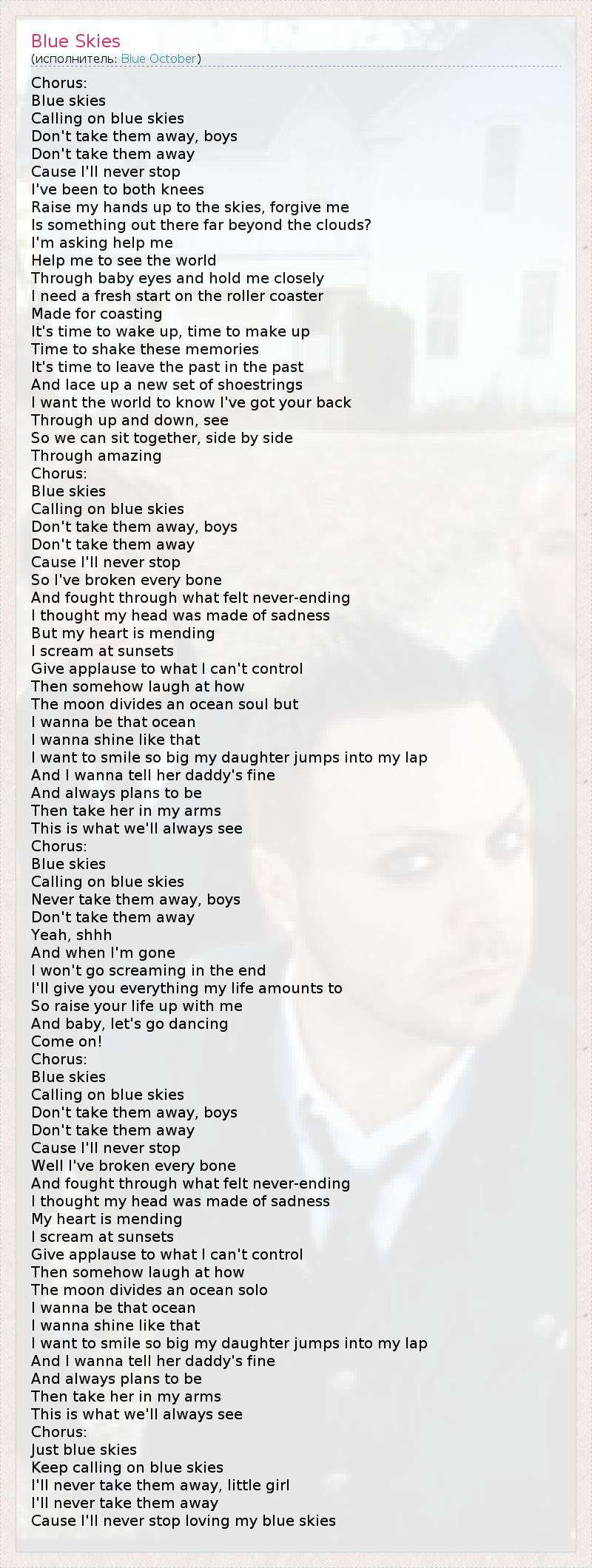 Chorus: Blue skies Calling on blue skies Don't take them away, boys Don't take them away Cause I'll never stop I've been to both knees Raise my hands up to the skies, forgive me Is something out there far beyond the clouds? I'm asking help me Help me to see the world Through baby eyes and hold me closely I need a fresh start on the roller coaster Made for coasting It's time to wake up, time to make up Time to shake these memories It's time to leave the past in the past And lace up a new set of shoestrings I want the world to know I've got your back Through up and down, see So we can sit together, side by side Through amazing Chorus: Blue skies Calling on blue skies Don't take them away, boys Don't take them away Cause I'll never stop So I've broken every bone And fought through what felt never-ending I thought my head was made of sadness But my heart is mending I scream at sunsets Give applause to what I can't control Then somehow laugh at how The moon divides an ocean soul but I wanna be that ocean I wanna shine like that I want to smile so big my daughter jumps into my lap And I wanna tell her daddy's fine And always plans to be Then take her in my arms This is what we'll always see Chorus: Blue skies Calling on blue skies Never take them away, boys Don't take them away Yeah, shhh And when I'm gone I won't go screaming in the end I'll give you everything my life amounts to So raise your life up with me And baby, let's go dancing Come on! Chorus: Blue skies Calling on blue skies Don't take them away, boys Don't take them away Cause I'll never stop Well I've broken every bone And fought through what felt never-ending I thought my head was made of sadness My heart is mending I scream at sunsets Give applause to what I can't control Then somehow laugh at how The moon divides an ocean solo I wanna be that ocean I wanna shine like that I want to smile so big my daughter jumps into my lap And I wanna tell her daddy's fine And always plans to be Then take her in my arms This is what we'll always see Chorus: Just blue skies Keep calling on blue skies I'll never take them away, little girl I'll never take them away Cause I'll never stop loving my blue skies