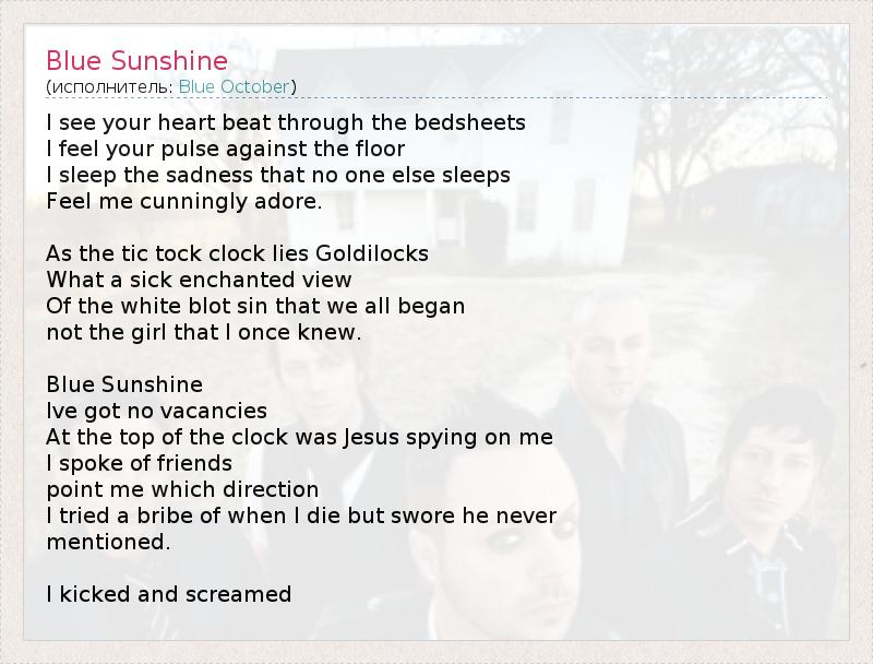 I see your heart beat through the bedsheets I feel your pulse against the floor I sleep the sadness that no one else sleeps Feel me cunningly adore. As the tic tock clock lies Goldilocks What a sick enchanted view Of the white blot sin that we all began not the girl that I once knew. Blue Sunshine Ive got no vacancies At the top of the clock was Jesus spying on me I spoke of friends point me which direction I tried a bribe of when I die but swore he never mentioned. I kicked and screamed