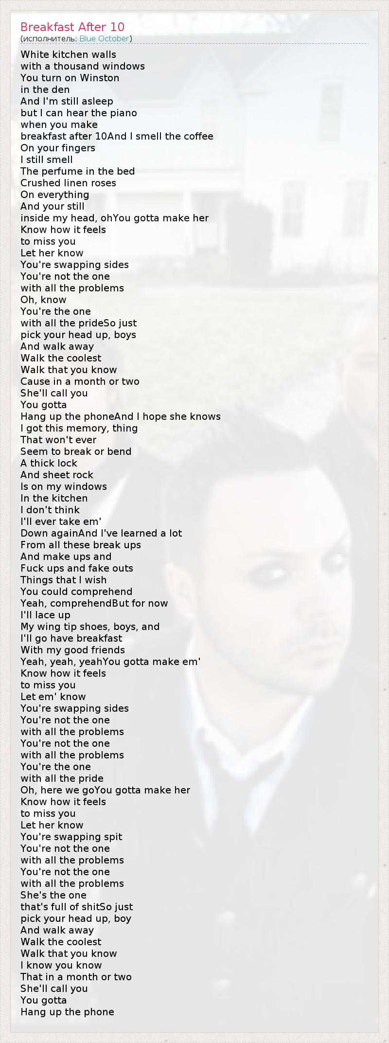 White kitchen walls with a thousand windows You turn on Winston in the den And I'm still asleep but I can hear the piano when you make breakfast after 10And I smell the coffee On your fingers I still smell The perfume in the bed Crushed linen roses On everything And your still inside my head, ohYou gotta make her Know how it feels to miss you Let her know You're swapping sides You're not the one with all the problems Oh, know You're the one with all the prideSo just pick your head up, boys And walk away Walk the coolest Walk that you know Cause in a month or two She'll call you You gotta Hang up the phoneAnd I hope she knows I got this memory, thing That won't ever Seem to break or bend A thick lock And sheet rock Is on my windows In the kitchen I don't think I'll ever take em' Down againAnd I've learned a lot From all these break ups And make ups and Fuck ups and fake outs Things that I wish You could comprehend Yeah, comprehendBut for now I'll lace up My wing tip shoes, boys, and I'll go have breakfast With my good friends Yeah, yeah, yeahYou gotta make em' Know how it feels to miss you Let em' know You're swapping sides You're not the one with all the problems You're not the one with all the problems You're the one with all the pride Oh, here we goYou gotta make her Know how it feels to miss you Let her know You're swapping spit You're not the one with all the problems You're not the one with all the problems She's the one that's full of shitSo just pick your head up, boy And walk away Walk the coolest Walk that you know I know you know That in a month or two She'll call you You gotta Hang up the phone