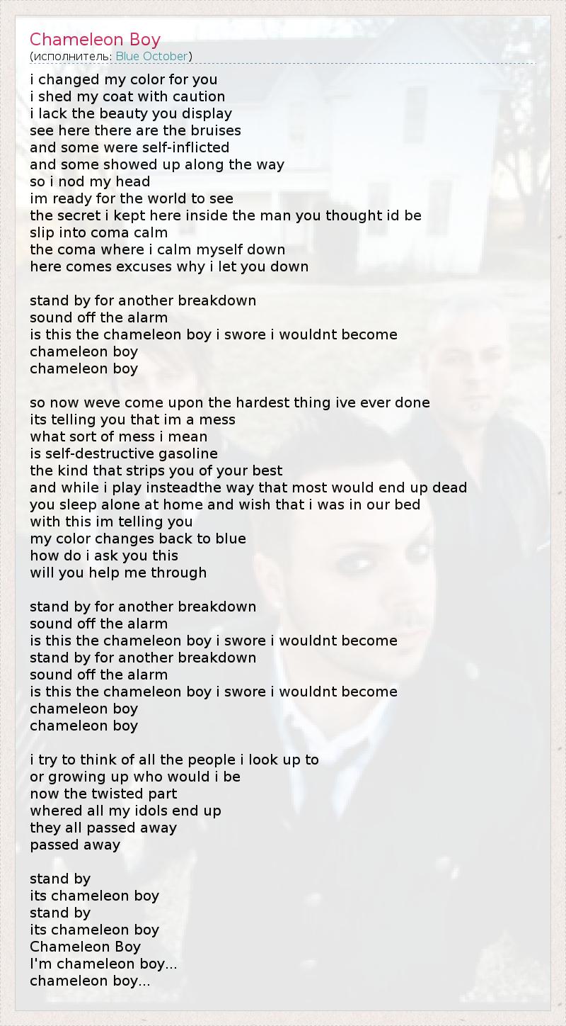 i changed my color for you i shed my coat with caution i lack the beauty you display see here there are the bruises and some were self-inflicted and some showed up along the way so i nod my head im ready for the world to see the secret i kept here inside the man you thought id be slip into coma calm the coma where i calm myself down here comes excuses why i let you down stand by for another breakdown sound off the alarm is this the chameleon boy i swore i wouldnt become chameleon boy chameleon boy so now weve come upon the hardest thing ive ever done its telling you that im a mess what sort of mess i mean is self-destructive gasoline the kind that strips you of your best and while i play insteadthe way that most would end up dead you sleep alone at home and wish that i was in our bed with this im telling you my color changes back to blue how do i ask you this will you help me through stand by for another breakdown sound off the alarm is this the chameleon boy i swore i wouldnt become stand by for another breakdown sound off the alarm is this the chameleon boy i swore i wouldnt become chameleon boy chameleon boy i try to think of all the people i look up to or growing up who would i be now the twisted part whered all my idols end up they all passed away passed away stand by its chameleon boy stand by its chameleon boy Chameleon Boy I'm chameleon boy... chameleon boy...