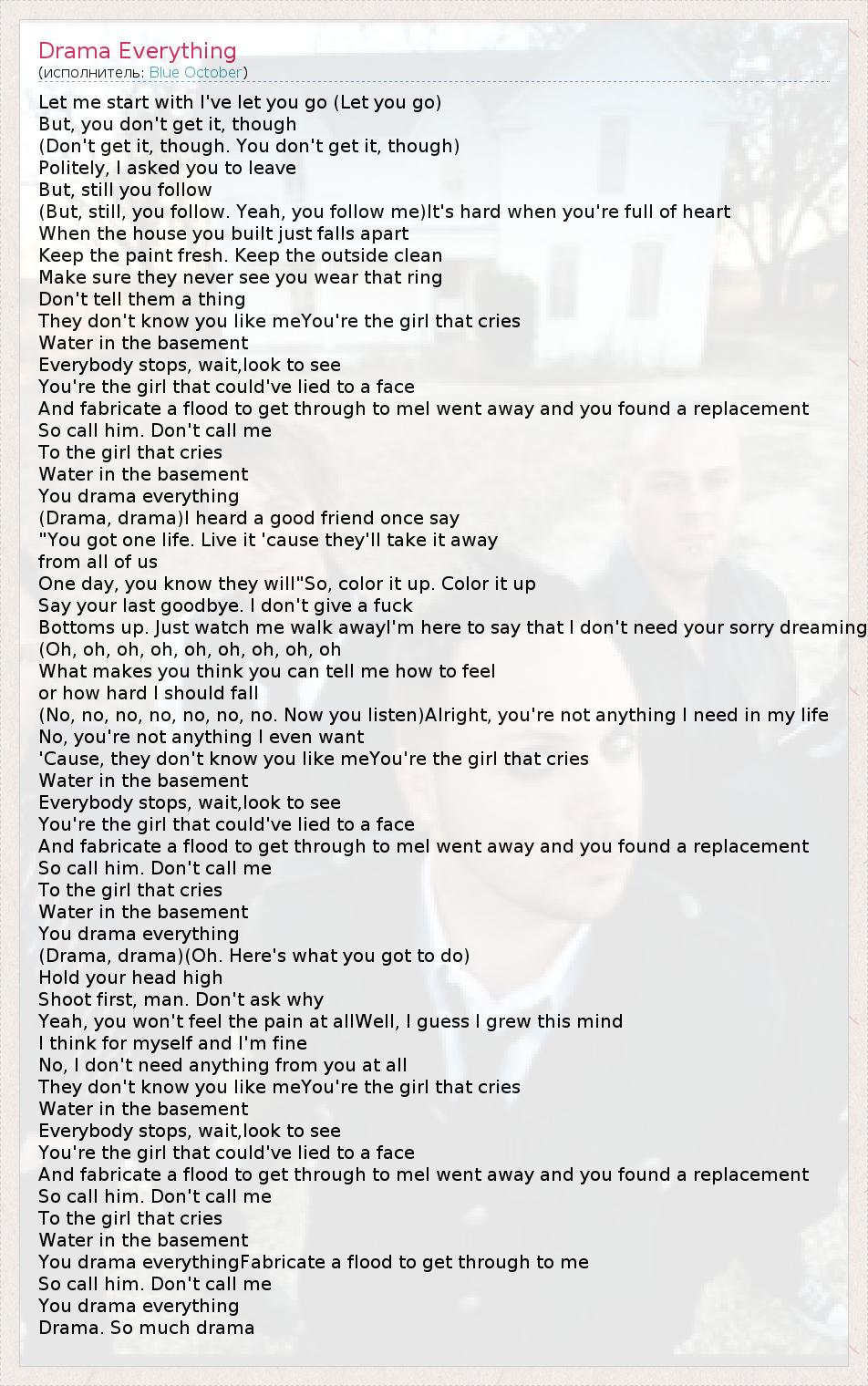 Let me start with I've let you go (Let you go) But, you don't get it, though (Don't get it, though. You don't get it, though) Politely, I asked you to leave But, still you follow (But, still, you follow. Yeah, you follow me)It's hard when you're full of heart When the house you built just falls apart Keep the paint fresh. Keep the outside clean Make sure they never see you wear that ring Don't tell them a thing They don't know you like meYou're the girl that cries Water in the basement Everybody stops, wait,look to see You're the girl that could've lied to a face And fabricate a flood to get through to meI went away and you found a replacement So call him. Don't call me To the girl that cries Water in the basement You drama everything (Drama, drama)I heard a good friend once say "You got one life. Live it 'cause they'll take it away from all of us One day, you know they will"So, color it up. Color it up Say your last goodbye. I don't give a fuck Bottoms up. Just watch me walk awayI'm here to say that I don't need your sorry dreaming (Oh, oh, oh, oh, oh, oh, oh, oh, oh What makes you think you can tell me how to feel or how hard I should fall (No, no, no, no, no, no, no. Now you listen)Alright, you're not anything I need in my life No, you're not anything I even want 'Cause, they don't know you like meYou're the girl that cries Water in the basement Everybody stops, wait,look to see You're the girl that could've lied to a face And fabricate a flood to get through to meI went away and you found a replacement So call him. Don't call me To the girl that cries Water in the basement You drama everything (Drama, drama)(Oh. Here's what you got to do) Hold your head high Shoot first, man. Don't ask why Yeah, you won't feel the pain at allWell, I guess I grew this mind I think for myself and I'm fine No, I don't need anything from you at all They don't know you like meYou're the girl that cries Water in the basement Everybody stops, wait,look to see You're the girl that could've lied to a face And fabricate a flood to get through to meI went away and you found a replacement So call him. Don't call me To the girl that cries Water in the basement You drama everythingFabricate a flood to get through to me So call him. Don't call me You drama everything Drama. So much drama