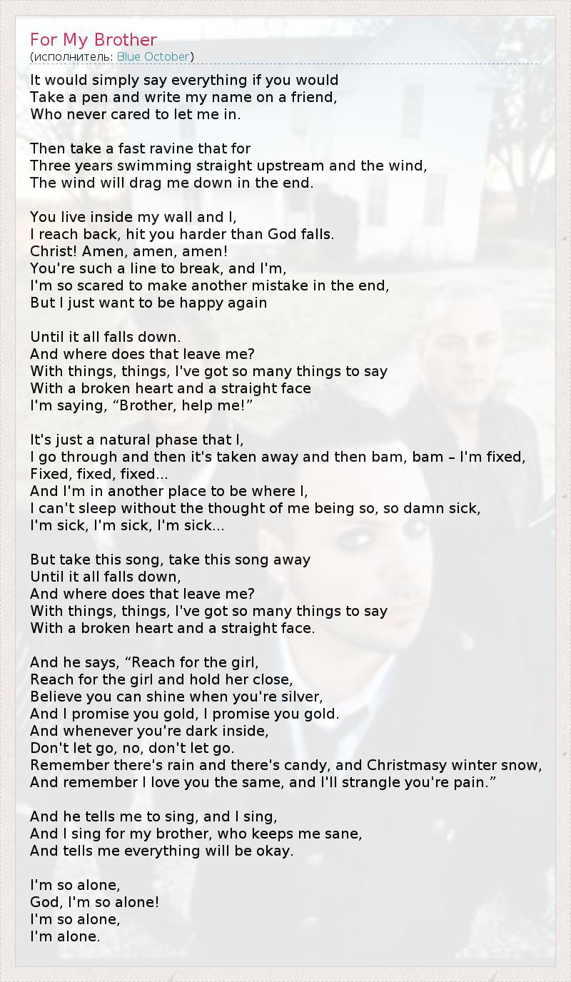 Если ты возьмёшь ручку и Напишешь моё имя другу, который никогда не волновался о том, Чтобы впустить меня, это просто скажет всё. А после я выбираю быструю стремнину для Трёх лет плавания против течения и ветра, Ветер, в итоге, потопит меня. Ты живёшь за моей стеной, а я, Я возвращаюсь, делаю тебе больнее, чем павшему богу. Господи Иисусе, аминь, аминь, аминь! Ты тот, с кем так и хочется порвать, а я, Я так боюсь ещё раз ошибиться под конец, Но я просто хочу снова быть счастливым, Пока всё не рухнет. А где же я тогда окажусь? Со всем, всем тем, что я должен высказать С разбитым сердцем и недрогнувшим лицом Я говорю: "Брат, помоги мне!" Это просто естественный этап, через который Я прохожу, а потом его уже нет, бах-бах — и меня Исправили, исправили, исправили... Я теперь в другом месте, где я, Я не могу заснуть без мысли о том, как же я чертовски болен. Я болен, болен, болен... Но возьми эту песню, забери её, Пока всё не рухнет, А где же я тогда окажусь? Со всем, всем тем, что я должен высказать С разбитым сердцем и недрогнувшим лицом. Он говорит: "Иди к своей девушке, Иди к ней и крепко обними её. Поверь, ты можешь сиять, даже когда ты серебро, А я обещаю тебе золото, я обещаю тебе золото. И когда твоя душа омрачится, Не распускайся, нет, не распускайся. Помни, что есть дождь, есть сладости и зимний рождественский снег, И помни, я по-прежнему люблю тебя, я помогу тебе покончить со страданиями". Он велит мне петь, и я пою, Я пою для своего брата, который хранит мой рассудок И говорит, что всё будет хорошо. Я так одинок, Боже, я так одинок! Я так одинок, Я одинок.