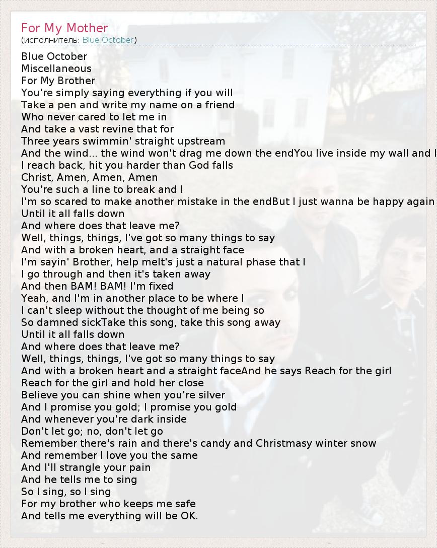Blue October Miscellaneous For My Brother You're simply saying everything if you will Take a pen and write my name on a friend Who never cared to let me in And take a vast revine that for Three years swimmin' straight upstream And the wind... the wind won't drag me down the endYou live inside my wall and I I reach back, hit you harder than God falls Christ, Amen, Amen, Amen You're such a line to break and I I'm so scared to make another mistake in the endBut I just wanna be happy again Until it all falls down And where does that leave me? Well, things, things, I've got so many things to say And with a broken heart, and a straight face I'm sayin' Brother, help meIt's just a natural phase that I I go through and then it's taken away And then BAM! BAM! I'm fixed Yeah, and I'm in another place to be where I I can't sleep without the thought of me being so So damned sickTake this song, take this song away Until it all falls down And where does that leave me? Well, things, things, I've got so many things to say And with a broken heart and a straight faceAnd he says Reach for the girl Reach for the girl and hold her close Believe you can shine when you're silver And I promise you gold; I promise you gold And whenever you're dark inside Don't let go; no, don't let go Remember there's rain and there's candy and Christmasy winter snow And remember I love you the same And I'll strangle your pain And he tells me to sing So I sing, so I sing For my brother who keeps me safe And tells me everything will be OK.