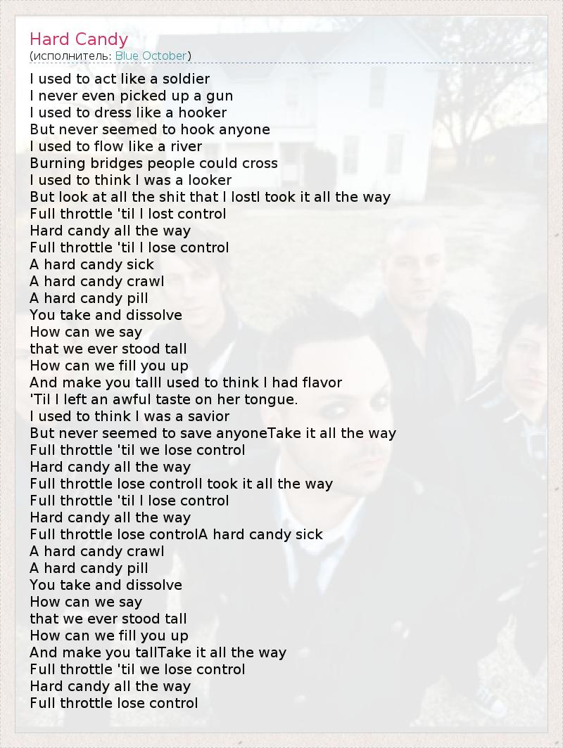Это интересно:Blue October (с англ. — печальный октябрь) — американская группа из Хьюстона, штат Техас, играющая в стиле альтернативный рок. Группа создана в 1995 году и в настоящее время её коллектив составляют Джастин Фёрстенфелд (ведущий солист, ритм-гитара), Джереми Фёрстенфелд (барабаны, перкуссия), Райан Делахуси (скрипка, виолончель, мандолина, фортепиано, бэк-вокал) и Мэтт Новески (бас-гитара, бэк-вокал).Создание... продолжение