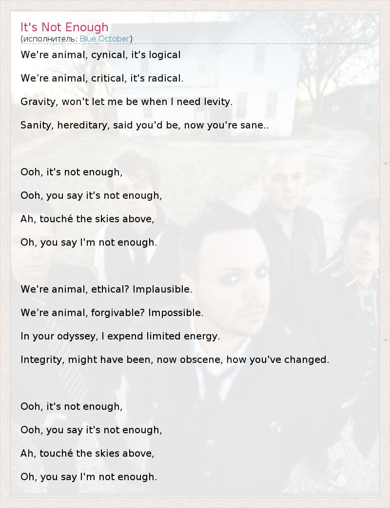 We're animal, cynical, it's logical We’re animal, critical, it's radical. Gravity, won't let me be when I need levity. Sanity, hereditary, said you'd be, now you're sane.. Ooh, it's not enough, Ooh, you say it's not enough, Ah, touché the skies above, Oh, you say I'm not enough. We're animal, ethical? Implausible. We’re animal, forgivable? Impossible. In your odyssey, I expend limited energy. Integrity, might have been, now obscene, how you've changed. Ooh, it's not enough, Ooh, you say it's not enough, Ah, touché the skies above, Oh, you say I'm not enough.