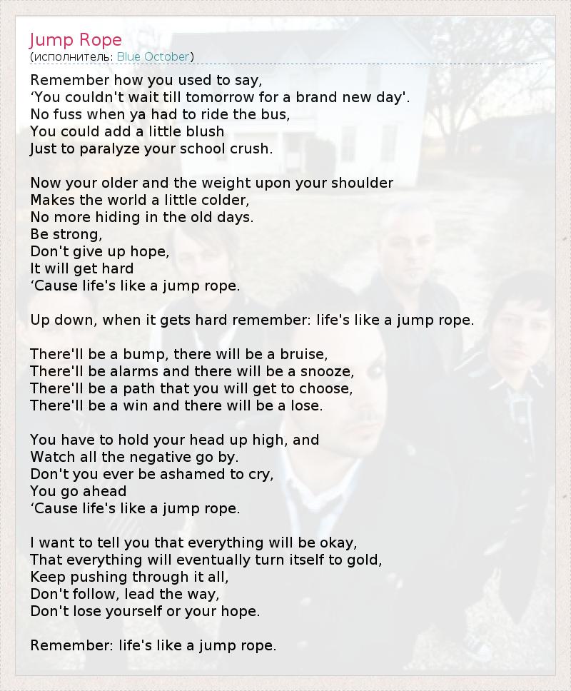Remember how you used to say, ‘You couldn't wait till tomorrow for a brand new day'. No fuss when ya had to ride the bus, You could add a little blush Just to paralyze your school crush. Now your older and the weight upon your shoulder Makes the world a little colder, No more hiding in the old days. Be strong, Don't give up hope, It will get hard ‘Cause life's like a jump rope. Up down, when it gets hard remember: life's like a jump rope. There'll be a bump, there will be a bruise, There'll be alarms and there will be a snooze, There'll be a path that you will get to choose, There'll be a win and there will be a lose. You have to hold your head up high, and Watch all the negative go by. Don't you ever be ashamed to cry, You go ahead ‘Cause life's like a jump rope. I want to tell you that everything will be okay, That everything will eventually turn itself to gold, Keep pushing through it all, Don't follow, lead the way, Don't lose yourself or your hope. Remember: life's like a jump rope.