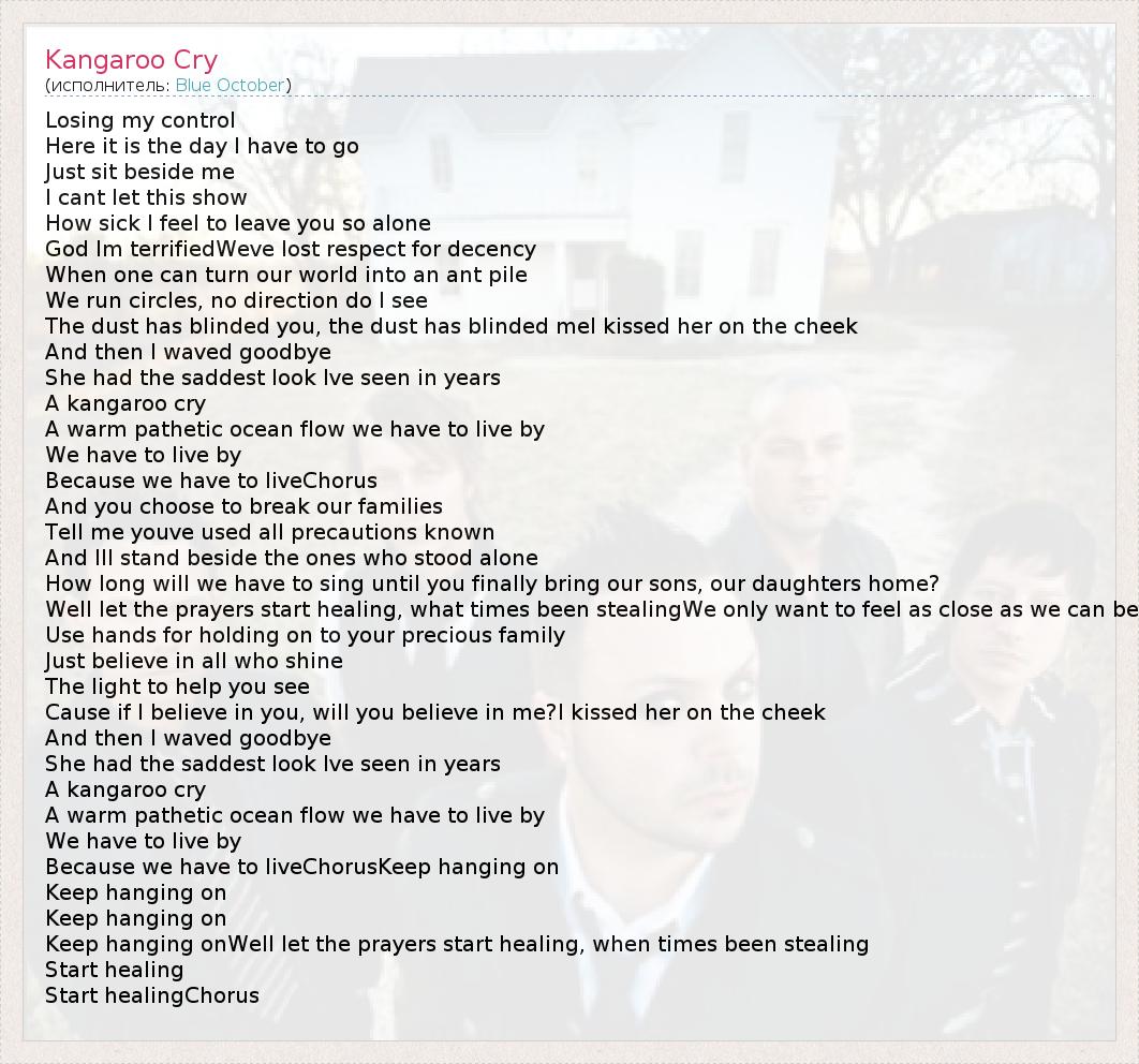 Losing my control Here it is the day I have to go Just sit beside me I cant let this show How sick I feel to leave you so alone God Im terrifiedWeve lost respect for decency When one can turn our world into an ant pile We run circles, no direction do I see The dust has blinded you, the dust has blinded meI kissed her on the cheek And then I waved goodbye She had the saddest look Ive seen in years A kangaroo cry A warm pathetic ocean flow we have to live by We have to live by Because we have to liveChorus And you choose to break our families Tell me youve used all precautions known And Ill stand beside the ones who stood alone How long will we have to sing until you finally bring our sons, our daughters home? Well let the prayers start healing, what times been stealingWe only want to feel as close as we can be Use hands for holding on to your precious family Just believe in all who shine The light to help you see Cause if I believe in you, will you believe in me?I kissed her on the cheek And then I waved goodbye She had the saddest look Ive seen in years A kangaroo cry A warm pathetic ocean flow we have to live by We have to live by Because we have to liveChorusKeep hanging on Keep hanging on Keep hanging on Keep hanging onWell let the prayers start healing, when times been stealing Start healing Start healingChorus