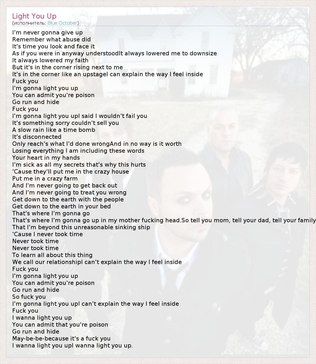 I'm never gonna give up Remember what abuse did It's time you look and face it As if you were in anyway understoodIt always lowered me to downsize It always lowered my faith But it's in the corner rising next to me It's in the corner like an upstageI can explain the way I feel inside Fuck you I'm gonna light you up You can admit you're poison Go run and hide Fuck you I'm gonna light you upI said I wouldn't fail you It's something sorry couldn't sell you A slow rain like a time bomb It's disconnected Only reach's what I'd done wrongAnd in no way is it worth Losing everything I am including these words Your heart in my hands I'm sick as all my secrets that's why this hurts 'Cause they'll put me in the crazy house Put me in a crazy farm And I'm never going to get back out And I'm never going to treat you wrong Get down to the earth with the people Get down to the earth in your bed That's where I'm gonna go That's where I'm gonna go up in my mother fucking head.So tell you mom, tell your dad, tell your family That I'm beyond this unreasonable sinking ship 'Cause I never took time Never took time Never took time To learn all about this thing We call our relationshipI can't explain the way I feel inside Fuck you I'm gonna light you up You can admit you're poison Go run and hide So fuck you I'm gonna light you upI can't explain the way I feel inside Fuck you I wanna light you up You can admit that you're poison Go run and hide May-be-be-because it's a fuck you I wanna light you upI wanna light you up.