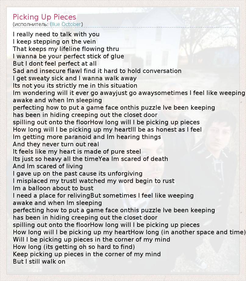 I really need to talk with you I keep stepping on the vein That keeps my lifeline flowing thru I wanna be your perfect stick of glue But I dont feel perfect at all Sad and insecure flawI find it hard to hold conversation I get sweaty sick and I wanna walk away Its not you its strictly me in this situation Im wondering will it ever go awayjust go awaysometimes I feel like weeping awake and when Im sleeping perfecting how to put a game face onthis puzzle Ive been keeping has been in hiding creeping out the closet door spilling out onto the floorHow long will I be picking up pieces How long will I be picking up my heartIll be as honest as I feel Im getting more paranoid and Im hearing things And they never turn out real It feels like my heart is made of pure steel Its just so heavy all the timeYea Im scared of death And Im scared of living I gave up on the past cause its unforgiving I misplaced my trustI watched my word begin to rust Im a balloon about to bust I need a place for relivingBut sometimes I feel like weeping awake and when Im sleeping perfecting how to put a game face onthis puzzle Ive been keeping has been in hiding creeping out the closet door spilling out onto the floorHow long will I be picking up pieces How long will I be picking up my heartHow long (in another space and time) Will I be picking up pieces in the corner of my mind How long (its getting oh so hard to find) Keep picking up pieces in the corner of my mind But I still walk on