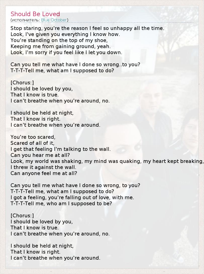 Stop staring, you're the reason I feel so unhappy all the time. Look, I've given you everything I know how. You're standing on the top of my shoe, Keeping me from gaining ground, yeah. Look, I'm sorry if you feel like I let you down. Can you tell me what have I done so wrong..to you? T-T-T-Tell me, what am I supposed to do? [Chorus:] I should be loved by you, That I know is true. I can't breathe when you're around, no. I should be held at night, That I know is right. I can't breathe when you're around. You're too scared, Scared of all of it, I get that feeling I'm talking to the wall. Can you hear me at all? Look, my world was shaking, my mind was quaking, my heart kept breaking, I threw it against the wall. Can anyone feel me at all? Can you tell me what have I done so wrong, to you? T-T-T-Tell me, what am I supposed to do? I got a feeling, you're falling out of love, with me. T-T-T-Tell me, who am I supposed to be? [Chorus:] I should be loved by you, That I know is true. I can't breathe when you're around, no. I should be held at night, That I know is right. I can't breathe when you're around.