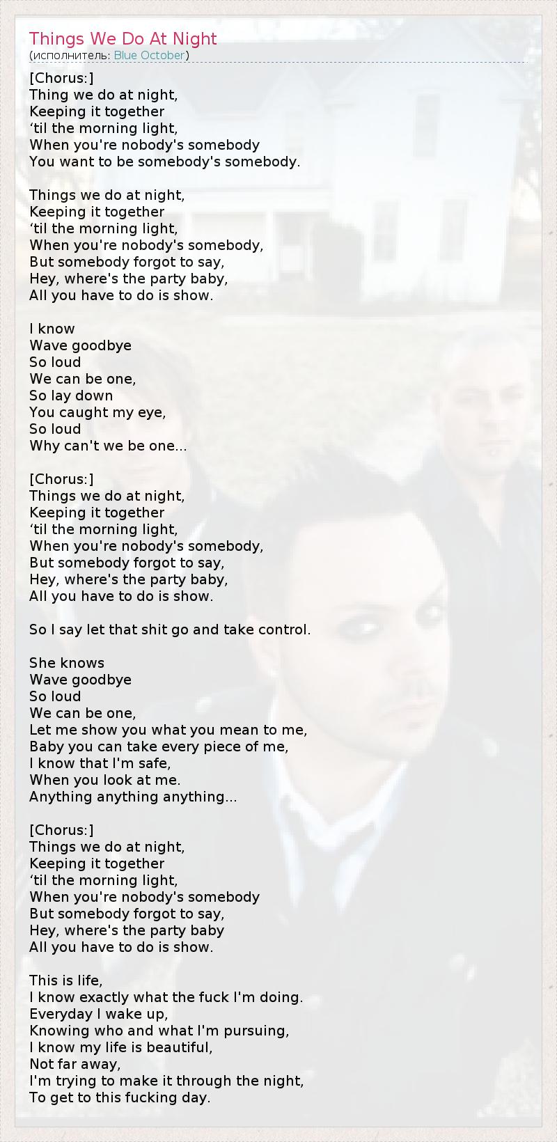 [Припев:] Вещи, которые мы делаем по ночам, Не расставаясь До первых солнечных лучей, Когда ты ничей, Ты хочешь быть кем-то для кого-то. Вещи, которые мы делаем по ночам, Не расставаясь До первых солнечных лучей, Когда ты ничей, Но кто-то забыл сказать: Эй, где же вечеринка, детка? Всё, что тебе нужно сделать, - показать. Я знаю, Машу рукой на прощанье... Так громко.. Мы можем быть едины. Так ложись.. Ты поймала мой взгляд. Так громко... Почему бы нам не быть единым... [Припев:] Вещи, которые мы делаем по ночам, Не расставаясь До первых солнечных лучей, Когда ты ничей. Но кто-то забыл сказать: Эй, где же вечеринка, детка? Всё, что тебе нужно сделать, - показать. Вот что я скажу: отпусти всю эту ерунду и возьми себя в руки. Она знает.. Машет рукой на прощанье.. Так громко... Мы можем быть едины... Дай же мне показать, что ты для меня значишь. Милая, я принадлежу тебе весь без остатка. Я знаю, что я в безопасности, Когда ты на меня смотришь. Что угодно, что угодно, что угодно... [Припев:] Вещи, которые мы делаем по ночам, Не расставаясь До первых солнечных лучей, Когда ты ничей. Но кто-то забыл сказать: Эй, детка, где же вечеринка? Всё, что тебе нужно сделать, - показать. Это жизнь, Я в точности знаю, какого черта я здесь делаю. Каждый день я встаю, Зная, кого и что я преследую. Я знаю, что жизнь прекрасна, И неподалеку Я пытаюсь пробраться сквозь ночь, Чтобы добраться до следующего чертова дня.