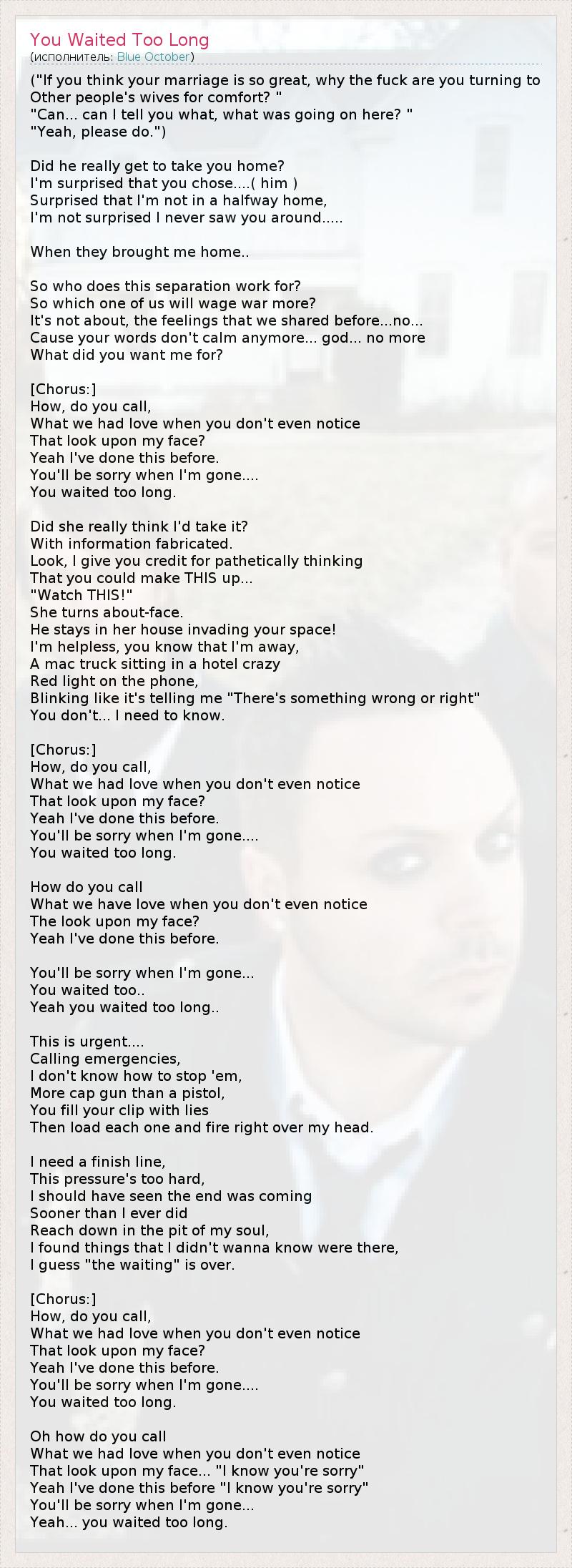 А как ты думаешь, о чем песня "You Waited Too Long" ?