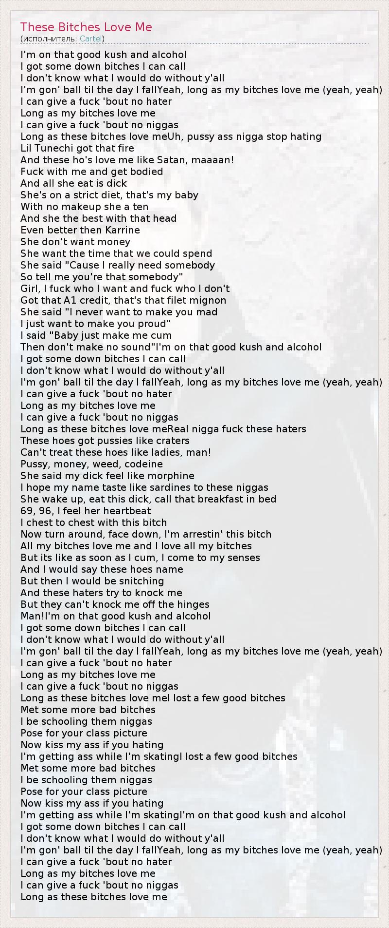 I'm on that good kush and alcohol I got some down bitches I can call I don't know what I would do without y'all I'm gon' ball til the day I fallYeah, long as my bitches love me (yeah, yeah) I can give a fuck 'bout no hater Long as my bitches love me I can give a fuck 'bout no niggas Long as these bitches love meUh, pussy ass nigga stop hating Lil Tunechi got that fire And these ho's love me like Satan, maaaan! Fuck with me and get bodied And all she eat is dick She's on a strict diet, that's my baby With no makeup she a ten And she the best with that head Even better then Karrine She don't want money She want the time that we could spend She said "Cause I really need somebody So tell me you're that somebody" Girl, I fuck who I want and fuck who I don't Got that A1 credit, that's that filet mignon She said "I never want to make you mad I just want to make you proud" I said "Baby just make me cum Then don't make no sound"I'm on that good kush and alcohol I got some down bitches I can call I don't know what I would do without y'all I'm gon' ball til the day I fallYeah, long as my bitches love me (yeah, yeah) I can give a fuck 'bout no hater Long as my bitches love me I can give a fuck 'bout no niggas Long as these bitches love meReal nigga fuck these haters These hoes got pussies like craters Can't treat these hoes like ladies, man! Pussy, money, weed, codeine She said my dick feel like morphine I hope my name taste like sardines to these niggas She wake up, eat this dick, call that breakfast in bed 69, 96, I feel her heartbeat I chest to chest with this bitch Now turn around, face down, I'm arrestin' this bitch All my bitches love me and I love all my bitches But its like as soon as I cum, I come to my senses And I would say these hoes name But then I would be snitching And these haters try to knock me But they can't knock me off the hinges Man!I'm on that good kush and alcohol I got some down bitches I can call I don't know what I would do without y'all I'm gon' ball til the day I fallYeah, long as my bitches love me (yeah, yeah) I can give a fuck 'bout no hater Long as my bitches love me I can give a fuck 'bout no niggas Long as these bitches love meI lost a few good bitches Met some more bad bitches I be schooling them niggas Pose for your class picture Now kiss my ass if you hating I'm getting ass while I'm skatingI lost a few good bitches Met some more bad bitches I be schooling them niggas Pose for your class picture Now kiss my ass if you hating I'm getting ass while I'm skatingI'm on that good kush and alcohol I got some down bitches I can call I don't know what I would do without y'all I'm gon' ball til the day I fallYeah, long as my bitches love me (yeah, yeah) I can give a fuck 'bout no hater Long as my bitches love me I can give a fuck 'bout no niggas Long as these bitches love me