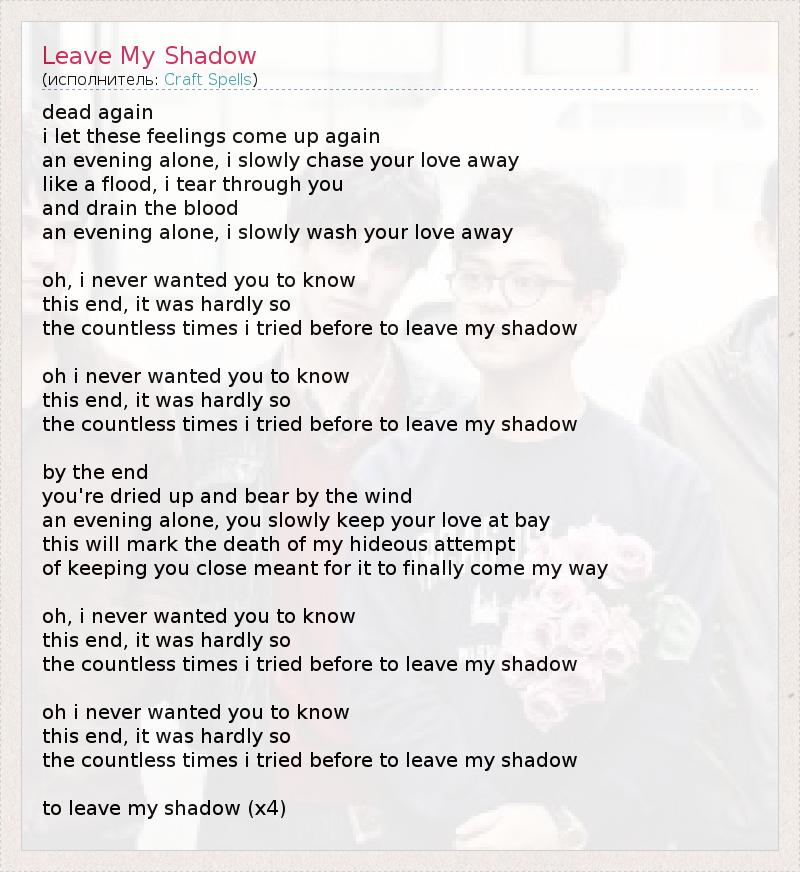 dead again i let these feelings come up again an evening alone, i slowly chase your love away like a flood, i tear through you and drain the blood an evening alone, i slowly wash your love away oh, i never wanted you to know this end, it was hardly so the countless times i tried before to leave my shadow oh i never wanted you to know this end, it was hardly so the countless times i tried before to leave my shadow by the end you're dried up and bear by the wind an evening alone, you slowly keep your love at bay this will mark the death of my hideous attempt of keeping you close meant for it to finally come my way oh, i never wanted you to know this end, it was hardly so the countless times i tried before to leave my shadow oh i never wanted you to know this end, it was hardly so the countless times i tried before to leave my shadow to leave my shadow (x4)