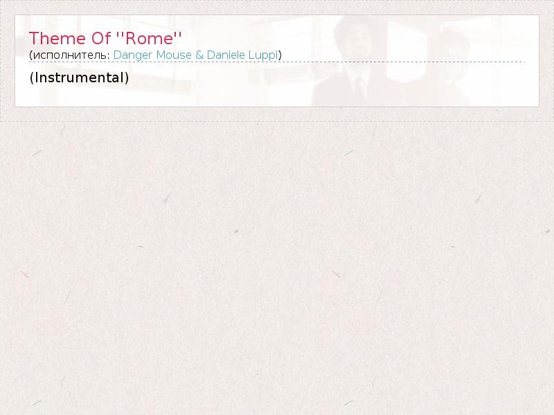 Это интересно:Продюсер Брайан Бартон, известный миру как Danger Mouse, работавший в таких проектах как Gnarls Barkley, Gorillaz, Broken Bells и других, задумал записать альбом, который бы отличался от всего того, что он делал раньше. В результате, вдохновившись спагетти-вестернами 60х-70х годов прошлого века и объединив усилия с итальянским композитором Даниэле Луппи, весной 2011 был выпущен альбом, получивший название Rome.... продолжение