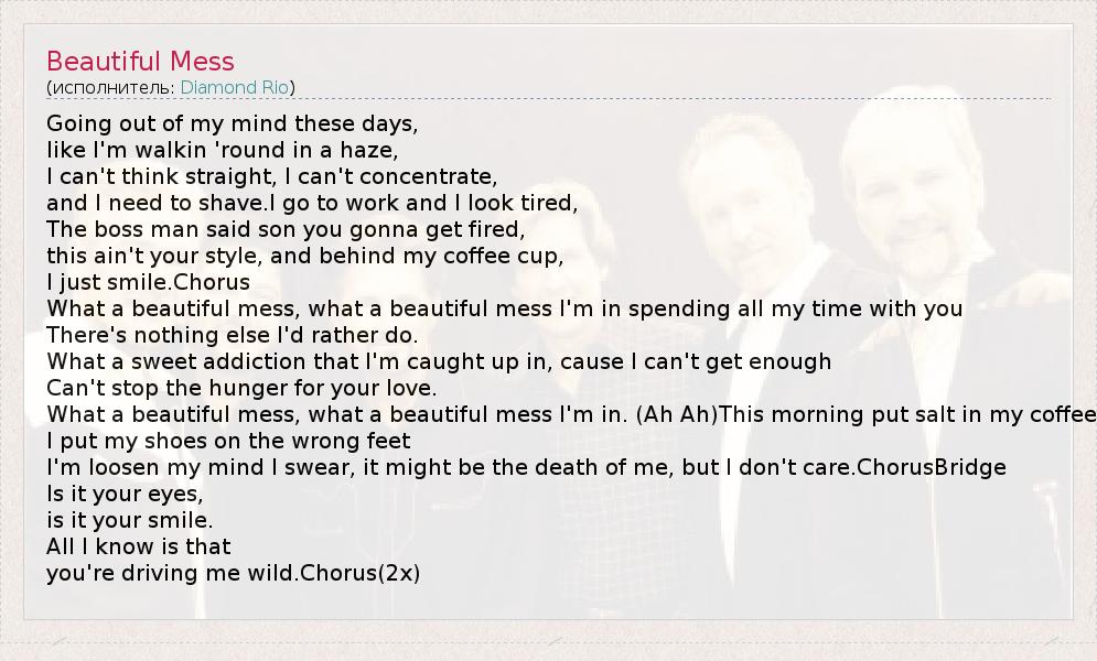 Going out of my mind these days, like I'm walkin 'round in a haze, I can't think straight, I can't concentrate, and I need to shave.I go to work and I look tired, The boss man said son you gonna get fired, this ain't your style, and behind my coffee cup, I just smile.Chorus What a beautiful mess, what a beautiful mess I'm in spending all my time with you There's nothing else I'd rather do. What a sweet addiction that I'm caught up in, cause I can't get enough Can't stop the hunger for your love. What a beautiful mess, what a beautiful mess I'm in. (Ah Ah)This morning put salt in my coffee I put my shoes on the wrong feet I'm loosen my mind I swear, it might be the death of me, but I don't care.ChorusBridge Is it your eyes, is it your smile. All I know is that you're driving me wild.Chorus(2x)