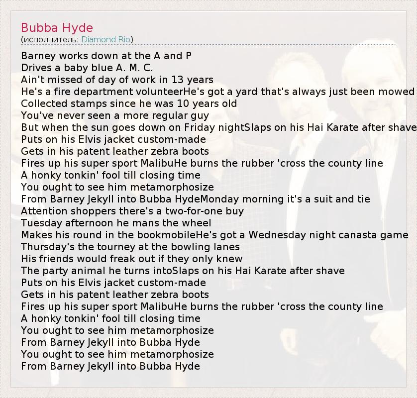 Barney works down at the A and P Drives a baby blue A. M. C. Ain't missed of day of work in 13 years He's a fire department volunteerHe's got a yard that's always just been mowed Collected stamps since he was 10 years old You've never seen a more regular guy But when the sun goes down on Friday nightSlaps on his Hai Karate after shave Puts on his Elvis jacket custom-made Gets in his patent leather zebra boots Fires up his super sport MalibuHe burns the rubber 'cross the county line A honky tonkin' fool till closing time You ought to see him metamorphosize From Barney Jekyll into Bubba HydeMonday morning it's a suit and tie Attention shoppers there's a two-for-one buy Tuesday afternoon he mans the wheel Makes his round in the bookmobileHe's got a Wednesday night canasta game Thursday's the tourney at the bowling lanes His friends would freak out if they only knew The party animal he turns intoSlaps on his Hai Karate after shave Puts on his Elvis jacket custom-made Gets in his patent leather zebra boots Fires up his super sport MalibuHe burns the rubber 'cross the county line A honky tonkin' fool till closing time You ought to see him metamorphosize From Barney Jekyll into Bubba Hyde You ought to see him metamorphosize From Barney Jekyll into Bubba Hyde