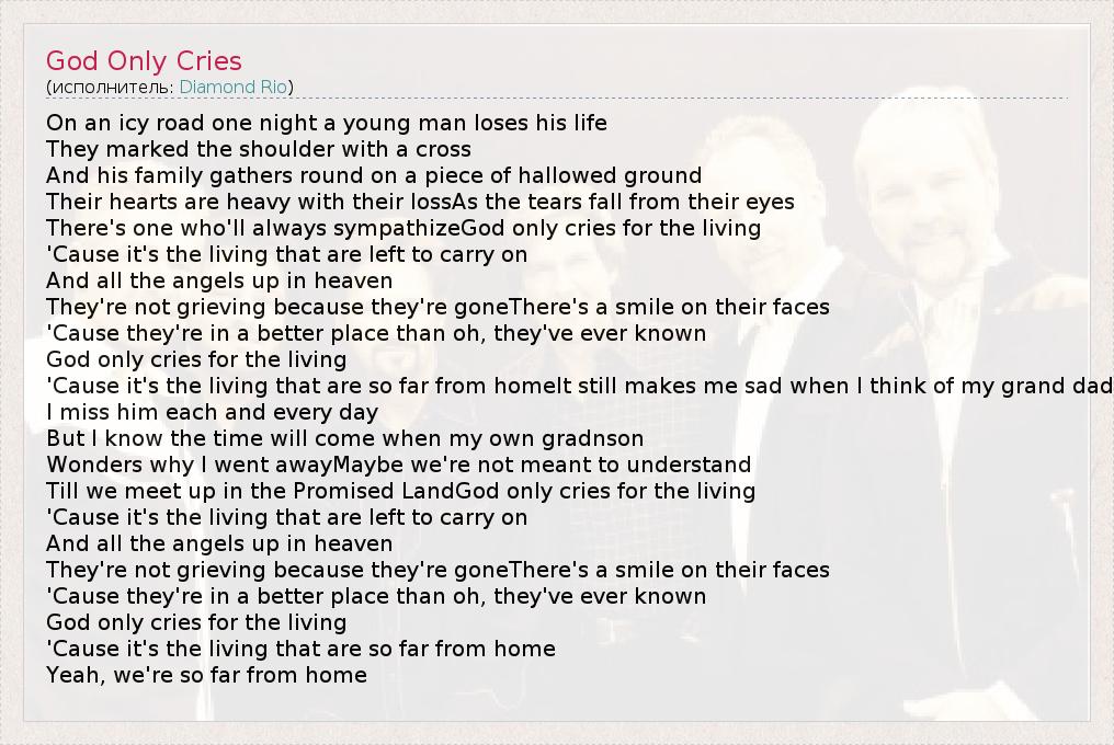 On an icy road one night a young man loses his life They marked the shoulder with a cross And his family gathers round on a piece of hallowed ground Their hearts are heavy with their lossAs the tears fall from their eyes There's one who'll always sympathizeGod only cries for the living 'Cause it's the living that are left to carry on And all the angels up in heaven They're not grieving because they're goneThere's a smile on their faces 'Cause they're in a better place than oh, they've ever known God only cries for the living 'Cause it's the living that are so far from homeIt still makes me sad when I think of my grand dad I miss him each and every day But I know the time will come when my own gradnson Wonders why I went awayMaybe we're not meant to understand Till we meet up in the Promised LandGod only cries for the living 'Cause it's the living that are left to carry on And all the angels up in heaven They're not grieving because they're goneThere's a smile on their faces 'Cause they're in a better place than oh, they've ever known God only cries for the living 'Cause it's the living that are so far from home Yeah, we're so far from home
