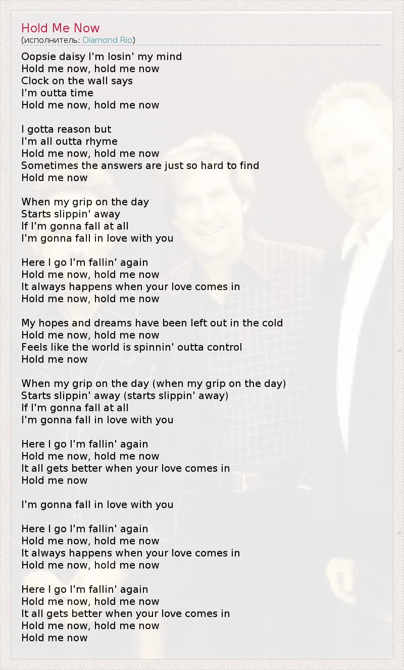 Oopsie daisy I'm losin' my mind Hold me now, hold me now Clock on the wall says I'm outta time Hold me now, hold me now I gotta reason but I'm all outta rhyme Hold me now, hold me now Sometimes the answers are just so hard to find Hold me now When my grip on the day Starts slippin' away If I'm gonna fall at all I'm gonna fall in love with you Here I go I'm fallin' again Hold me now, hold me now It always happens when your love comes in Hold me now, hold me now My hopes and dreams have been left out in the cold Hold me now, hold me now Feels like the world is spinnin' outta control Hold me now When my grip on the day (when my grip on the day) Starts slippin' away (starts slippin' away) If I'm gonna fall at all I'm gonna fall in love with you Here I go I'm fallin' again Hold me now, hold me now It all gets better when your love comes in Hold me now I'm gonna fall in love with you Here I go I'm fallin' again Hold me now, hold me now It always happens when your love comes in Hold me now, hold me now Here I go I'm fallin' again Hold me now, hold me now It all gets better when your love comes in Hold me now, hold me now Hold me now