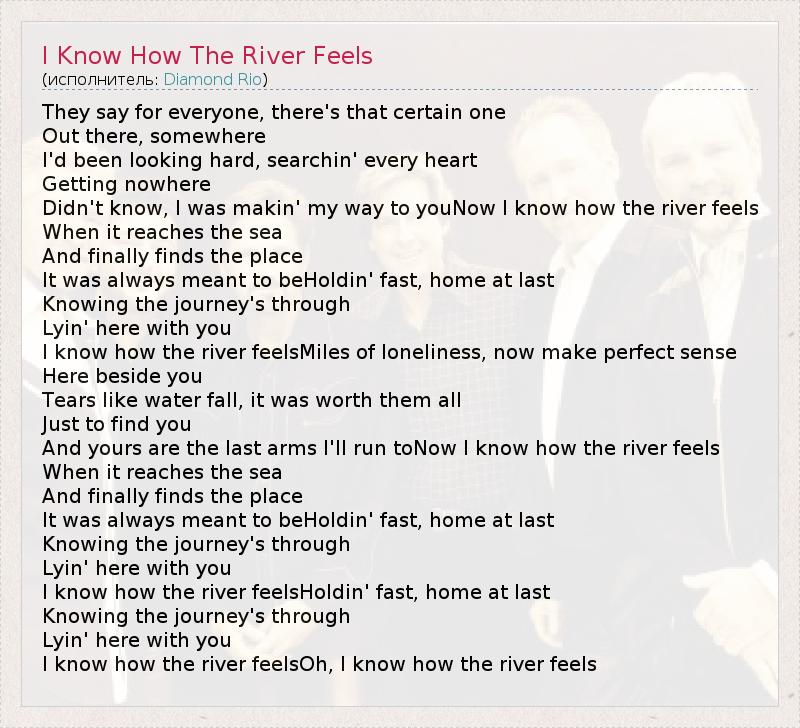 They say for everyone, there's that certain one Out there, somewhere I'd been looking hard, searchin' every heart Getting nowhere Didn't know, I was makin' my way to youNow I know how the river feels When it reaches the sea And finally finds the place It was always meant to beHoldin' fast, home at last Knowing the journey's through Lyin' here with you I know how the river feelsMiles of loneliness, now make perfect sense Here beside you Tears like water fall, it was worth them all Just to find you And yours are the last arms I'll run toNow I know how the river feels When it reaches the sea And finally finds the place It was always meant to beHoldin' fast, home at last Knowing the journey's through Lyin' here with you I know how the river feelsHoldin' fast, home at last Knowing the journey's through Lyin' here with you I know how the river feelsOh, I know how the river feels