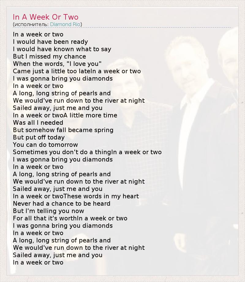 In a week or two I would have been ready I would have known what to say But I missed my chance When the words, "I love you" Came just a little too lateIn a week or two I was gonna bring you diamonds In a week or two A long, long string of pearls and We would've run down to the river at night Sailed away, just me and you In a week or twoA little more time Was all I needed But somehow fall became spring But put off today You can do tomorrow Sometimes you don't do a thingIn a week or two I was gonna bring you diamonds In a week or two A long, long string of pearls and We would've run down to the river at night Sailed away, just me and you In a week or twoThese words in my heart Never had a chance to be heard But I'm telling you now For all that it's worthIn a week or two I was gonna bring you diamonds In a week or two A long, long string of pearls and We would've run down to the river at night Sailed away, just me and you In a week or two