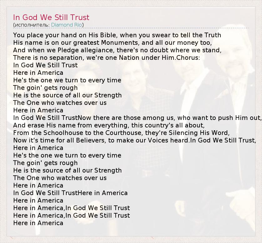 You place your hand on His Bible, when you swear to tell the Truth His name is on our greatest Monuments, and all our money too, And when we Pledge allegiance, there's no doubt where we stand, There is no separation, we're one Nation under Him.Chorus: In God We Still Trust Here in America He's the one we turn to every time The goin' gets rough He is the source of all our Strength The One who watches over us Here in America In God We Still TrustNow there are those among us, who want to push Him out, And erase His name from everything, this country's all about, From the Schoolhouse to the Courthouse, they're Silencing His Word, Now it's time for all Believers, to make our Voices heard.In God We Still Trust, Here in America He's the one we turn to every time The goin' gets rough He is the source of all our Strength The One who watches over us Here in America In God We Still TrustHere in America Here in America Here in America,In God We Still Trust Here in America,In God We Still Trust Here in America
