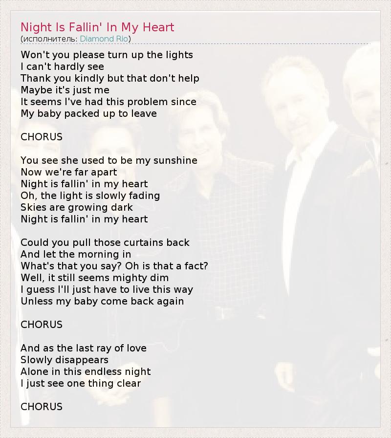 Won't you please turn up the lights I can't hardly see Thank you kindly but that don't help Maybe it's just me It seems I've had this problem since My baby packed up to leave CHORUS You see she used to be my sunshine Now we're far apart Night is fallin' in my heart Oh, the light is slowly fading Skies are growing dark Night is fallin' in my heart Could you pull those curtains back And let the morning in What's that you say? Oh is that a fact? Well, it still seems mighty dim I guess I'll just have to live this way Unless my baby come back again CHORUS And as the last ray of love Slowly disappears Alone in this endless night I just see one thing clear CHORUS
