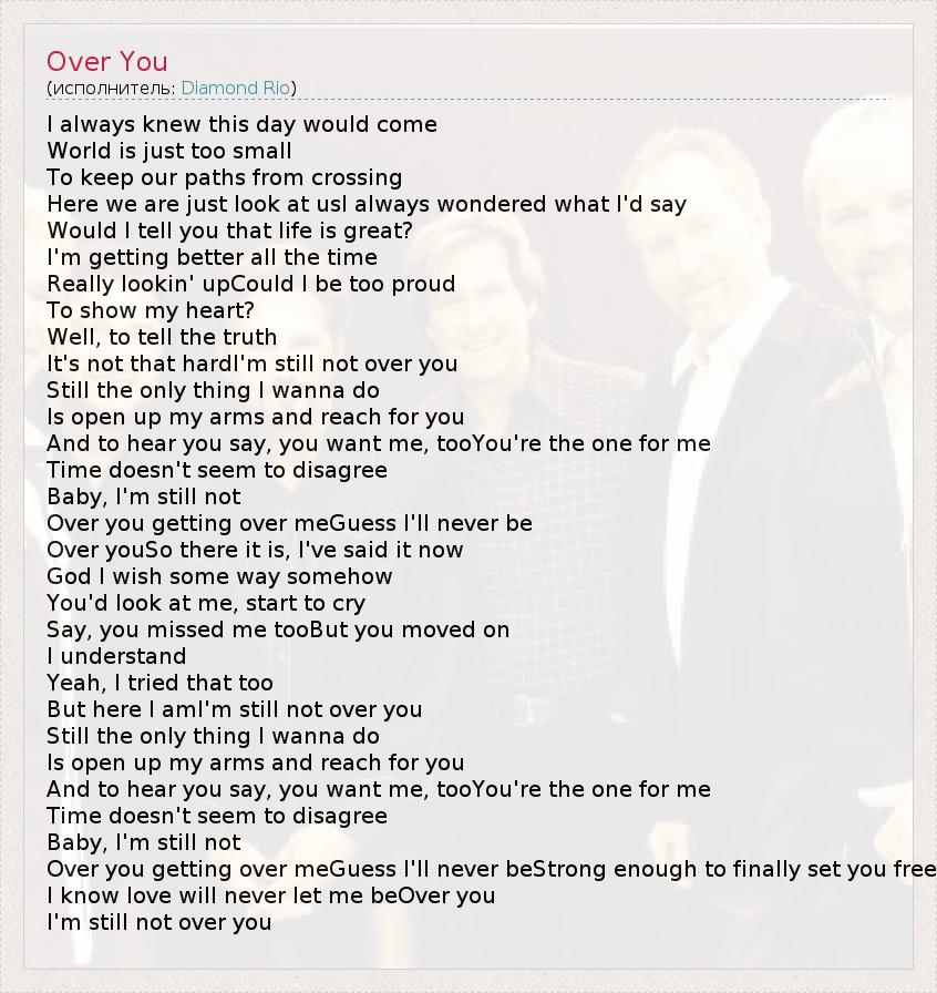 I always knew this day would come World is just too small To keep our paths from crossing Here we are just look at usI always wondered what I'd say Would I tell you that life is great? I'm getting better all the time Really lookin' upCould I be too proud To show my heart? Well, to tell the truth It's not that hardI'm still not over you Still the only thing I wanna do Is open up my arms and reach for you And to hear you say, you want me, tooYou're the one for me Time doesn't seem to disagree Baby, I'm still not Over you getting over meGuess I'll never be Over youSo there it is, I've said it now God I wish some way somehow You'd look at me, start to cry Say, you missed me tooBut you moved on I understand Yeah, I tried that too But here I amI'm still not over you Still the only thing I wanna do Is open up my arms and reach for you And to hear you say, you want me, tooYou're the one for me Time doesn't seem to disagree Baby, I'm still not Over you getting over meGuess I'll never beStrong enough to finally set you free I know love will never let me beOver you I'm still not over you