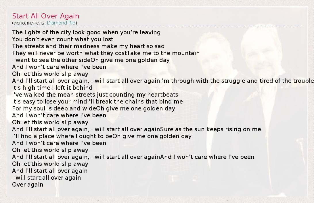 The lights of the city look good when you're leaving You don't even count what you lost The streets and their madness make my heart so sad They will never be worth what they costTake me to the mountain I want to see the other sideOh give me one golden day And I won't care where I've been Oh let this world slip away And I'll start all over again, I will start all over againI'm through with the struggle and tired of the trouble It's high time I left it behind I've walked the mean streets just counting my heartbeats It's easy to lose your mindI'll break the chains that bind me For my soul is deep and wideOh give me one golden day And I won't care where I've been Oh let this world slip away And I'll start all over again, I will start all over againSure as the sun keeps rising on me I'll find a place where I ought to beOh give me one golden day And I won't care where I've been Oh let this world slip away And I'll start all over again, I will start all over againAnd I won't care where I've been Oh let this world slip away And I'll start all over again I will start all over again Over again