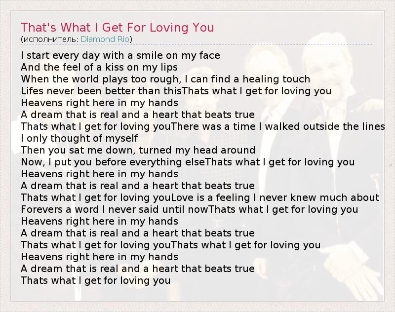I start every day with a smile on my face And the feel of a kiss on my lips When the world plays too rough, I can find a healing touch Lifes never been better than thisThats what I get for loving you Heavens right here in my hands A dream that is real and a heart that beats true Thats what I get for loving youThere was a time I walked outside the lines I only thought of myself Then you sat me down, turned my head around Now, I put you before everything elseThats what I get for loving you Heavens right here in my hands A dream that is real and a heart that beats true Thats what I get for loving youLove is a feeling I never knew much about Forevers a word I never said until nowThats what I get for loving you Heavens right here in my hands A dream that is real and a heart that beats true Thats what I get for loving youThats what I get for loving you Heavens right here in my hands A dream that is real and a heart that beats true Thats what I get for loving you