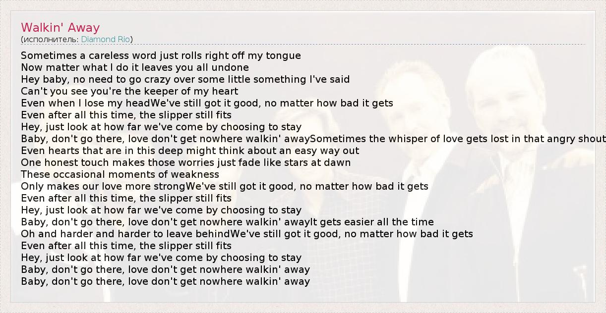 Sometimes a careless word just rolls right off my tongue Now matter what I do it leaves you all undone Hey baby, no need to go crazy over some little something I've said Can't you see you're the keeper of my heart Even when I lose my headWe've still got it good, no matter how bad it gets Even after all this time, the slipper still fits Hey, just look at how far we've come by choosing to stay Baby, don't go there, love don't get nowhere walkin' awaySometimes the whisper of love gets lost in that angry shout Even hearts that are in this deep might think about an easy way out One honest touch makes those worries just fade like stars at dawn These occasional moments of weakness Only makes our love more strongWe've still got it good, no matter how bad it gets Even after all this time, the slipper still fits Hey, just look at how far we've come by choosing to stay Baby, don't go there, love don't get nowhere walkin' awayIt gets easier all the time Oh and harder and harder to leave behindWe've still got it good, no matter how bad it gets Even after all this time, the slipper still fits Hey, just look at how far we've come by choosing to stay Baby, don't go there, love don't get nowhere walkin' away Baby, don't go there, love don't get nowhere walkin' away