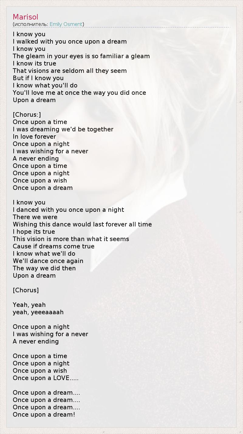 I know you I walked with you once upon a dream I know you The gleam in your eyes is so familiar a gleam I know its true That visions are seldom all they seem But if I know you I know what you'll do You'll love me at once the way you did once Upon a dream [Chorus:] Once upon a time I was dreaming we'd be together In love forever Once upon a night I was wishing for a never A never ending Once upon a time Once upon a night Once upon a wish Once upon a dream I know you I danced with you once upon a night There we were Wishing this dance would last forever all time I hope its true This vision is more than what it seems Cause if dreams come true I know what we'll do We'll dance once again The way we did then Upon a dream [Chorus] Yeah, yeah yeah, yeeeaaaah Once upon a night I was wishing for a never A never ending Once upon a time Once upon a night Once upon a wish Once upon a LOVE..... Once upon a dream.... Once upon a dream.... Once upon a dream.... Once upon a dream!