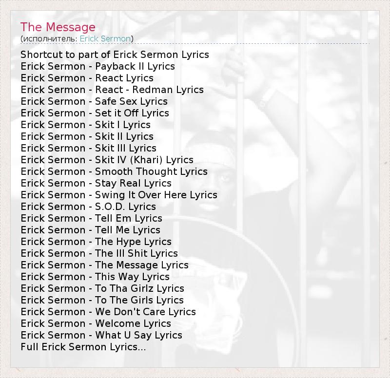 Это интересно:Также известный как Эрик Онассис, родился 25 ноября в 1968 году, в Лонг-Айленде, Нью-Йорк. Американский рэпер, музыкант и продюссер. Более известен как участник группы EPMD, популярной в конце 80-х, начале 90-х годов, и как продюссер. “Зеленоглазый Бандит” (прозвище Сермона) создал приличное количество сольных альбомов. Он начал записывать свои альбомы в 1993 году на Def Jam.Его первый альбом назывался... продолжение
