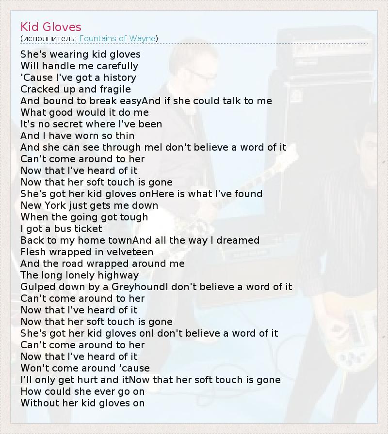 She's wearing kid gloves Will handle me carefully 'Cause I've got a history Cracked up and fragile And bound to break easyAnd if she could talk to me What good would it do me It's no secret where I've been And I have worn so thin And she can see through meI don't believe a word of it Can't come around to her Now that I've heard of it Now that her soft touch is gone She's got her kid gloves onHere is what I've found New York just gets me down When the going got tough I got a bus ticket Back to my home townAnd all the way I dreamed Flesh wrapped in velveteen And the road wrapped around me The long lonely highway Gulped down by a GreyhoundI don't believe a word of it Can't come around to her Now that I've heard of it Now that her soft touch is gone She's got her kid gloves onI don't believe a word of it Can't come around to her Now that I've heard of it Won't come around 'cause I'll only get hurt and itNow that her soft touch is gone How could she ever go on Without her kid gloves on