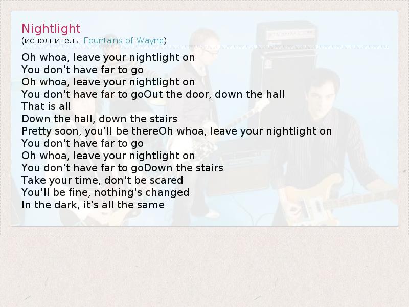 Oh whoa, leave your nightlight on You don't have far to go Oh whoa, leave your nightlight on You don't have far to goOut the door, down the hall That is all Down the hall, down the stairs Pretty soon, you'll be thereOh whoa, leave your nightlight on You don't have far to go Oh whoa, leave your nightlight on You don't have far to goDown the stairs Take your time, don't be scared You'll be fine, nothing's changed In the dark, it's all the same