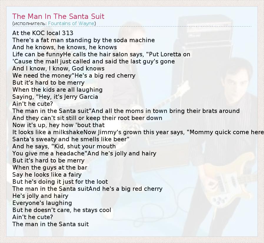 At the KOC local 313 There's a fat man standing by the soda machine And he knows, he knows, he knows Life can be funnyHe calls the hair salon says, "Put Loretta on 'Cause the mall just called and said the last guy's gone And I know, I know, God knows We need the money"He's a big red cherry But it's hard to be merry When the kids are all laughing Saying, "Hey, it's Jerry Garcia Ain't he cute? The man in the Santa suit"And all the moms in town bring their brats around And they can't sit still or keep their root beer down Now it's up, hey how 'bout that It looks like a milkshakeNow Jimmy's grown this year says, "Mommy quick come here Santa's sweaty and he smells like beer" And he says, "Kid, shut your mouth You give me a headache"And he's jolly and hairy But it's hard to be merry When the guys at the bar Say he looks like a fairy But he's doing it just for the loot The man in the Santa suitAnd he's a big red cherry He's jolly and hairy Everyone's laughing But he doesn't care, he stays cool Ain't he cute? The man in the Santa suit