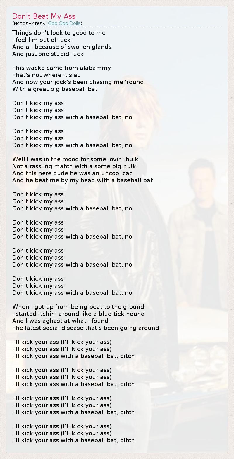 Things don't look to good to me I feel I'm out of luck And all because of swollen glands And just one stupid fuck This wacko came from alabammy That's not where it's at And now your jock's been chasing me 'round With a great big baseball bat Don't kick my ass Don't kick my ass Don't kick my ass with a baseball bat, no Don't kick my ass Don't kick my ass Don't kick my ass with a baseball bat, no Well I was in the mood for some lovin' bulk Not a rassling match with a some big hulk And this here dude he was an uncool cat And he beat me by my head with a baseball bat Don't kick my ass Don't kick my ass Don't kick my ass with a baseball bat, no Don't kick my ass Don't kick my ass Don't kick my ass with a baseball bat, no Don't kick my ass Don't kick my ass Don't kick my ass with a baseball bat, no Don't kick my ass Don't kick my ass Don't kick my ass with a baseball bat, no When I got up from being beat to the ground I started itchin' around like a blue-tick hound And I was aghast at what I found The latest social disease that's been going around I'll kick your ass (I'll kick your ass) I'll kick your ass (I'll kick your ass) I'll kick your ass with a baseball bat, bitch I'll kick your ass (I'll kick your ass) I'll kick your ass (I'll kick your ass) I'll kick your ass with a baseball bat, bitch I'll kick your ass (I'll kick your ass) I'll kick your ass (I'll kick your ass) I'll kick your ass with a baseball bat, bitch I'll kick your ass (I'll kick your ass) I'll kick your ass (I'll kick your ass) I'll kick your ass with a baseball bat, bitch