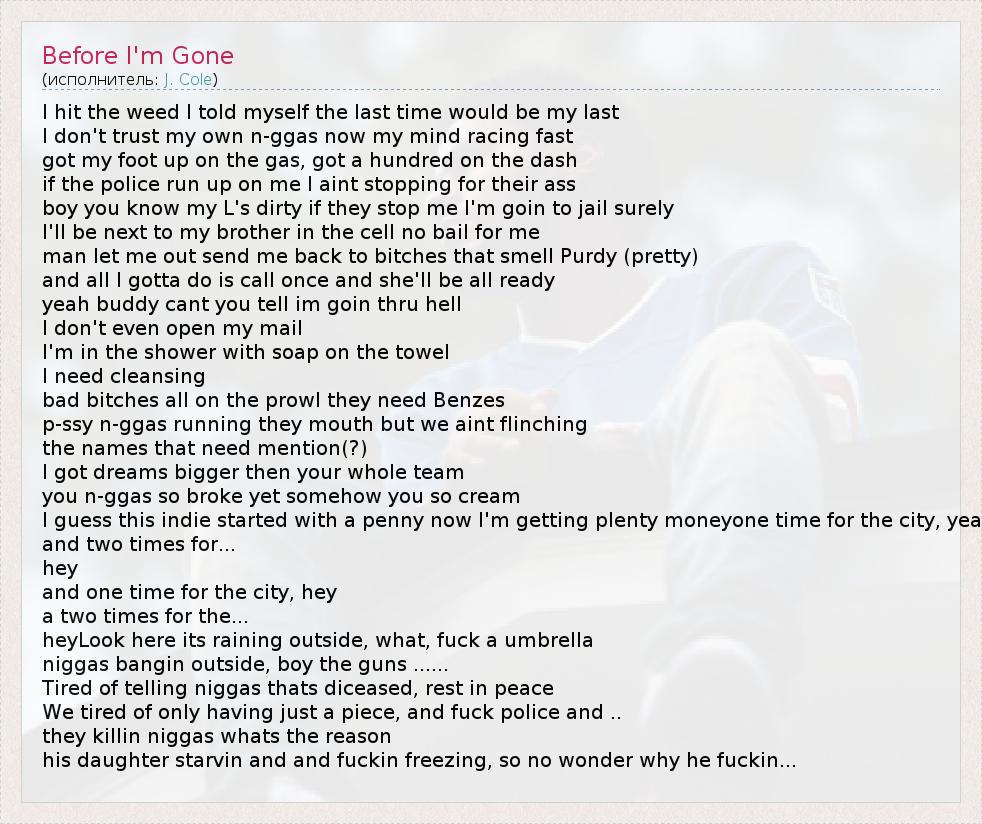I hit the weed I told myself the last time would be my last I don't trust my own n-ggas now my mind racing fast got my foot up on the gas, got a hundred on the dash if the police run up on me I aint stopping for their ass boy you know my L's dirty if they stop me I'm goin to jail surely I'll be next to my brother in the cell no bail for me man let me out send me back to bitches that smell Purdy (pretty) and all I gotta do is call once and she'll be all ready yeah buddy cant you tell im goin thru hell I don't even open my mail I'm in the shower with soap on the towel I need cleansing bad bitches all on the prowl they need Benzes p-ssy n-ggas running they mouth but we aint flinching the names that need mention(?) I got dreams bigger then your whole team you n-ggas so broke yet somehow you so cream I guess this indie started with a penny now I'm getting plenty moneyone time for the city, yea and two times for... hey and one time for the city, hey a two times for the... heyLook here its raining outside, what, fuck a umbrella niggas bangin outside, boy the guns ...... Tired of telling niggas thats diceased, rest in peace We tired of only having just a piece, and fuck police and .. they killin niggas whats the reason his daughter starvin and and fuckin freezing, so no wonder why he fuckin...