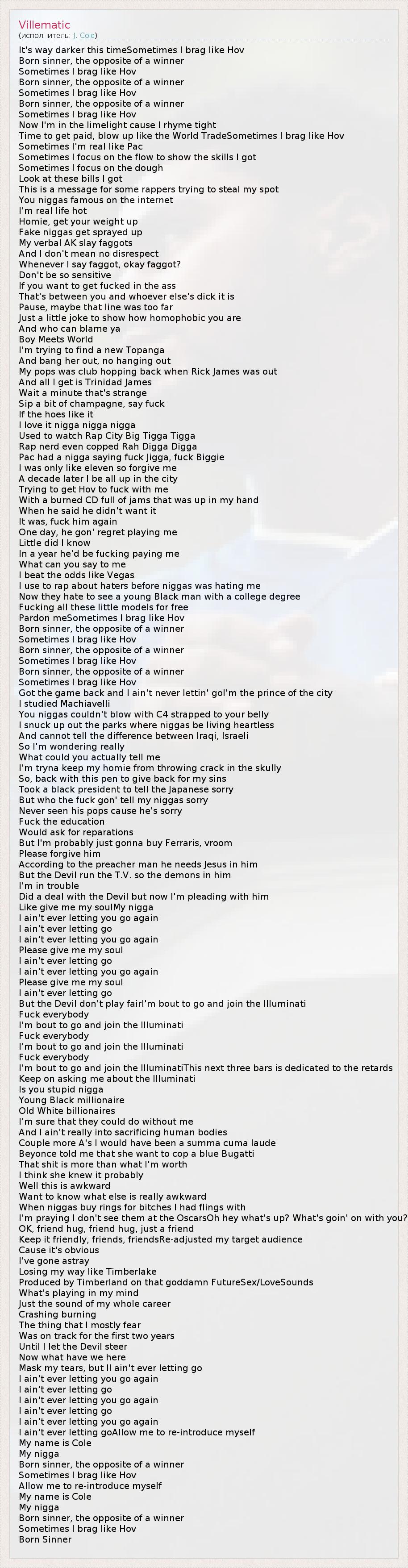 It's way darker this timeSometimes I brag like Hov Born sinner, the opposite of a winner Sometimes I brag like Hov Born sinner, the opposite of a winner Sometimes I brag like Hov Born sinner, the opposite of a winner Sometimes I brag like Hov Now I'm in the limelight cause I rhyme tight Time to get paid, blow up like the World TradeSometimes I brag like Hov Sometimes I'm real like Pac Sometimes I focus on the flow to show the skills I got Sometimes I focus on the dough Look at these bills I got This is a message for some rappers trying to steal my spot You niggas famous on the internet I'm real life hot Homie, get your weight up Fake niggas get sprayed up My verbal AK slay faggots And I don't mean no disrespect Whenever I say faggot, okay faggot? Don't be so sensitive If you want to get fucked in the ass That's between you and whoever else's dick it is Pause, maybe that line was too far Just a little joke to show how homophobic you are And who can blame ya Boy Meets World I'm trying to find a new Topanga And bang her out, no hanging out My pops was club hopping back when Rick James was out And all I get is Trinidad James Wait a minute that's strange Sip a bit of champagne, say fuck If the hoes like it I love it nigga nigga nigga Used to watch Rap City Big Tigga Tigga Rap nerd even copped Rah Digga Digga Pac had a nigga saying fuck Jigga, fuck Biggie I was only like eleven so forgive me A decade later I be all up in the city Trying to get Hov to fuck with me With a burned CD full of jams that was up in my hand When he said he didn't want it It was, fuck him again One day, he gon' regret playing me Little did I know In a year he'd be fucking paying me What can you say to me I beat the odds like Vegas I use to rap about haters before niggas was hating me Now they hate to see a young Black man with a college degree Fucking all these little models for free Pardon meSometimes I brag like Hov Born sinner, the opposite of a winner Sometimes I brag like Hov Born sinner, the opposite of a winner Sometimes I brag like Hov Born sinner, the opposite of a winner Sometimes I brag like Hov Got the game back and I ain't never lettin' goI'm the prince of the city I studied Machiavelli You niggas couldn't blow with C4 strapped to your belly I snuck up out the parks where niggas be living heartless And cannot tell the difference between Iraqi, Israeli So I'm wondering really What could you actually tell me I'm tryna keep my homie from throwing crack in the skully So, back with this pen to give back for my sins Took a black president to tell the Japanese sorry But who the fuck gon' tell my niggas sorry Never seen his pops cause he's sorry Fuck the education Would ask for reparations But I'm probably just gonna buy Ferraris, vroom Please forgive him According to the preacher man he needs Jesus in him But the Devil run the T.V. so the demons in him I'm in trouble Did a deal with the Devil but now I'm pleading with him Like give me my soulMy nigga I ain't ever letting you go again I ain't ever letting go I ain't ever letting you go again Please give me my soul I ain't ever letting go I ain't ever letting you go again Please give me my soul I ain't ever letting go But the Devil don't play fairI'm bout to go and join the Illuminati Fuck everybody I'm bout to go and join the Illuminati Fuck everybody I'm bout to go and join the Illuminati Fuck everybody I'm bout to go and join the IlluminatiThis next three bars is dedicated to the retards Keep on asking me about the Illuminati Is you stupid nigga Young Black millionaire Old White billionaires I'm sure that they could do without me And I ain't really into sacrificing human bodies Couple more A's I would have been a summa cuma laude Beyonce told me that she want to cop a blue Bugatti That shit is more than what I'm worth I think she knew it probably Well this is awkward Want to know what else is really awkward When niggas buy rings for bitches I had flings with I'm praying I don't see them at the OscarsOh hey what's up? What's goin' on with you? OK, friend hug, friend hug, just a friend Keep it friendly, friends, friendsRe-adjusted my target audience Cause it's obvious I've gone astray Losing my way like Timberlake Produced by Timberland on that goddamn FutureSex/LoveSounds What's playing in my mind Just the sound of my whole career Crashing burning The thing that I mostly fear Was on track for the first two years Until I let the Devil steer Now what have we here Mask my tears, but II ain't ever letting go I ain't ever letting you go again I ain't ever letting go I ain't ever letting you go again I ain't ever letting go I ain't ever letting you go again I ain't ever letting goAllow me to re-introduce myself My name is Cole My nigga Born sinner, the opposite of a winner Sometimes I brag like Hov Allow me to re-introduce myself My name is Cole My nigga Born sinner, the opposite of a winner Sometimes I brag like Hov Born Sinner